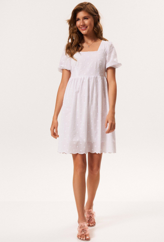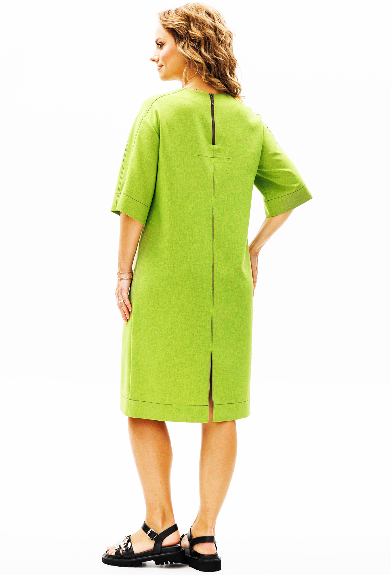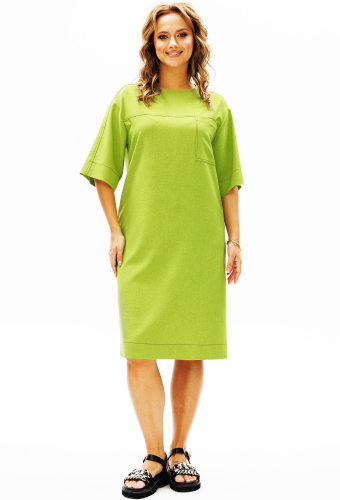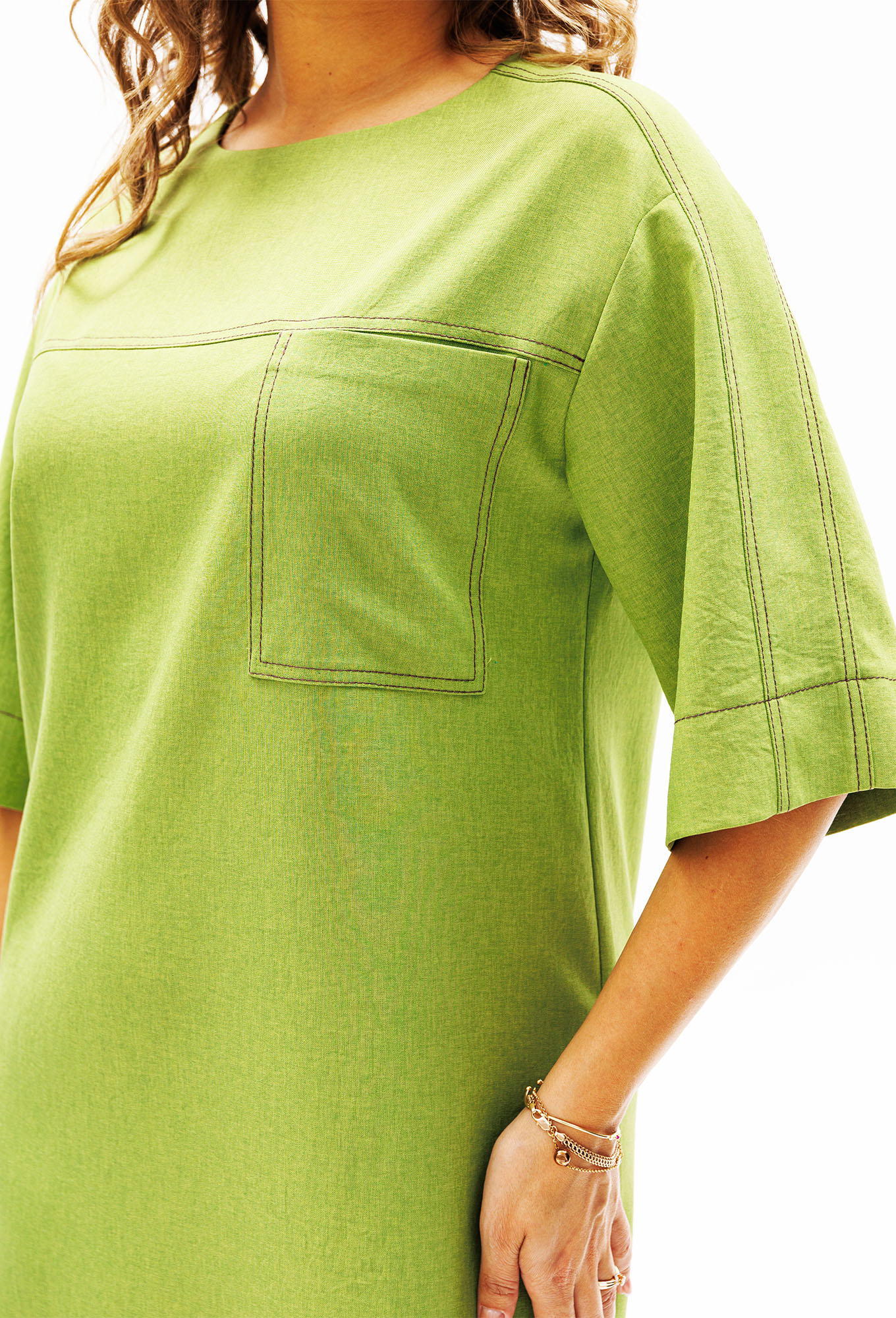 Платье прямого силуэта выполнено из плательной летней ткани Вишер со структурой льна. Перед с кокеткой и накладным карманом в районе груди. Рукав втачной одношовный. Вдоль плеча с переходом на рукав вставлена планка. Спинка со средним швом. Сверху в среднем шве молния, снизу разрез. По периметру кармана, вдоль шва соединения кокетки, планки, среднего шва, по низу рукава и по низу платья проложены декоративные строчки.
