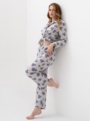 Пижама женская из набивного полотна состоит из футболки и бридж. Футболка прямого силуэта с коротким рукавом-реглан. «V»-образная горловина полочки обработана обтачкой, горловина спинки окантована бейкой из основного полотна. Низ изделия обработан швом «в подгибку», низ рукавов – краеобмёточной машиной. Бриджи прилегающего силуэта с боковыми карманами в швах. Пояс цельнокроеный на резинке.