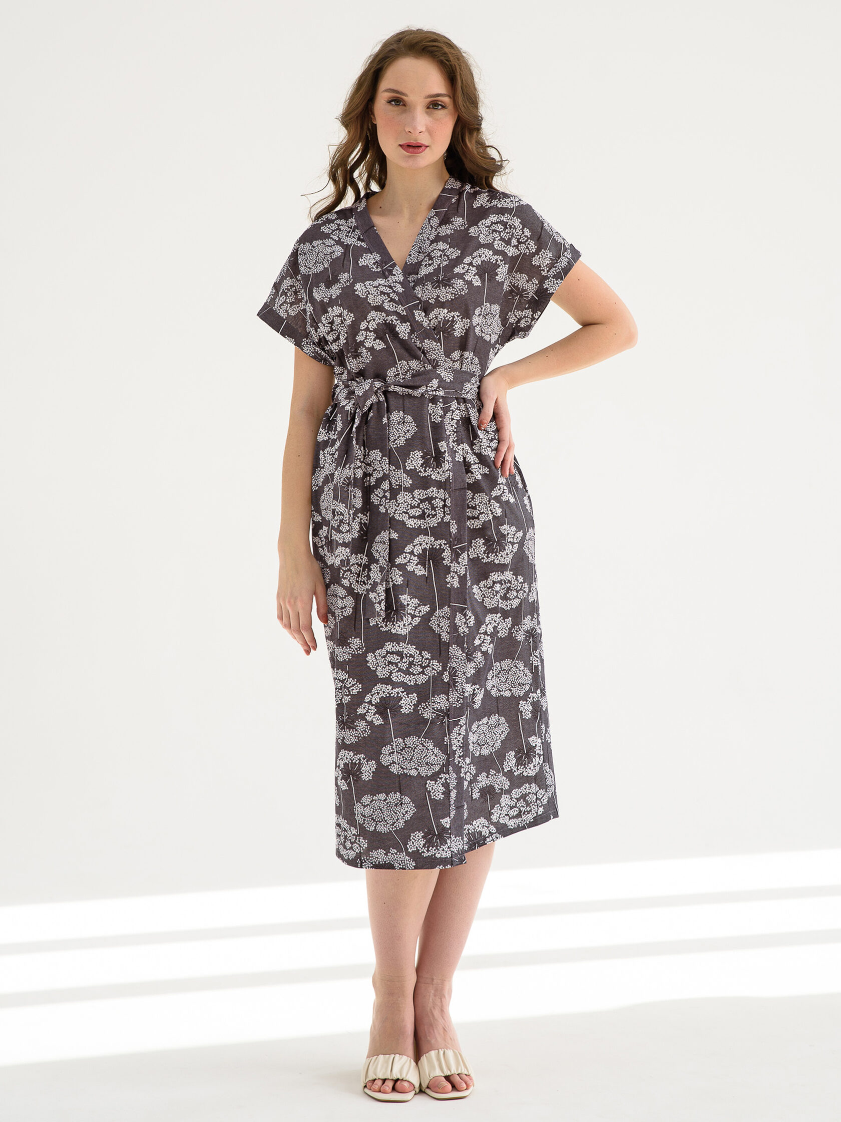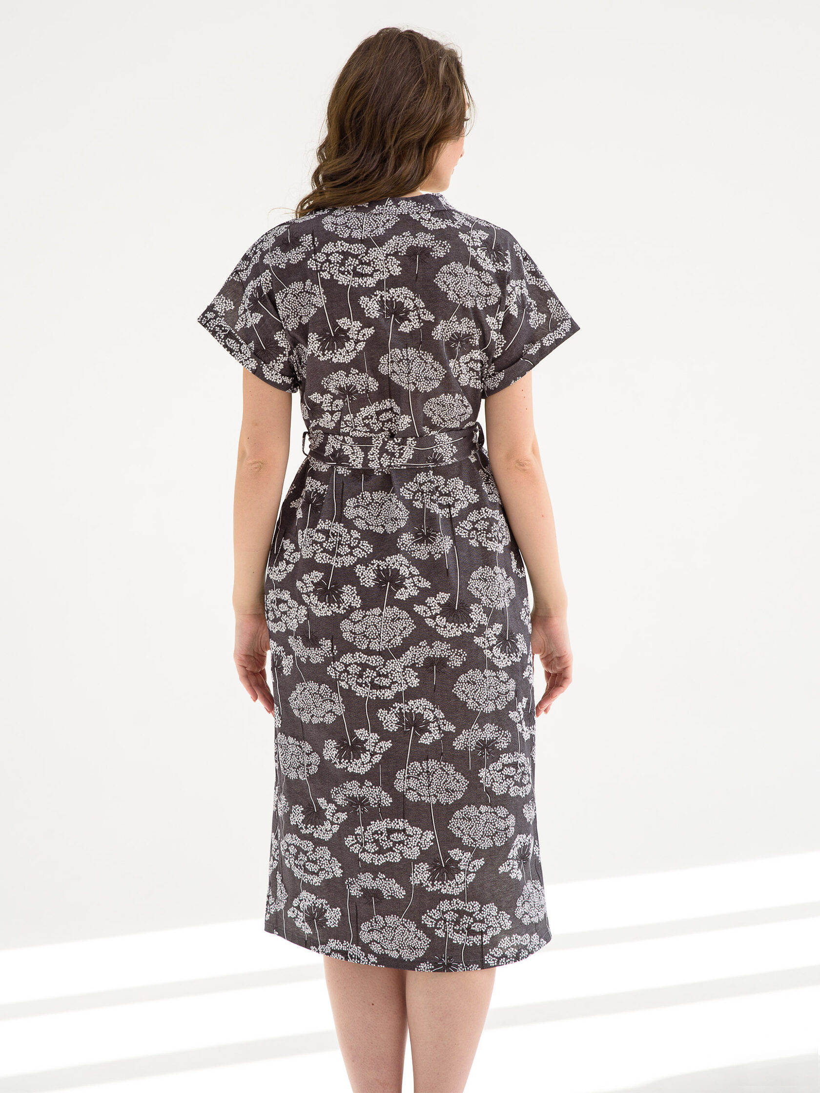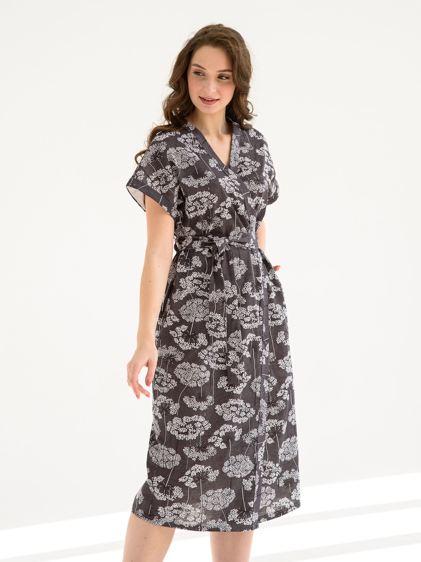 Халат женский запашной с поясом, из набивного х/б трикотажного полотна, прямого силуэта, длиной ниже линии колена. Изделие с цельнокроенным коротким рукавом.