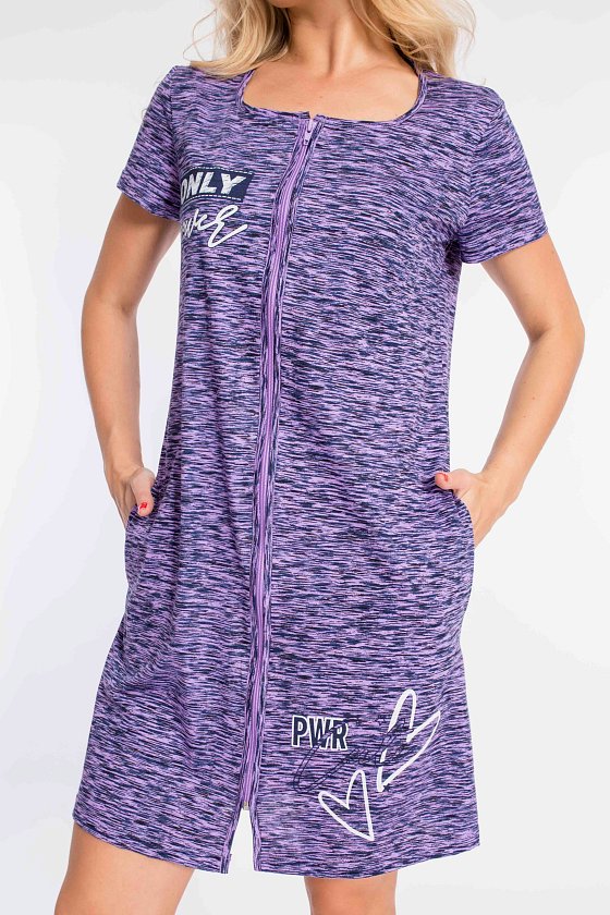 Женский халат на молнии с коротким рукавом выполнен из кулирки реактив. Принт спереди добавляет интересный акцент халату. Наличие карманов в боковых швах обеспечивает удобство для хранения мелких предметов.