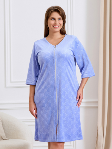 Халат женский из гладкокрашенного трикотажного махрового полотна, прямого силуэта, с горловиной овальной формы, втачными рукавами длиной ¾ длины, карманами в боковых швах и центральной бортовой застежкой на тесьму «молния». Полочка – с двумя небольшими косыми кокетками с кружевом в швах соединения кокеток с основными деталями, на левой полочке выполнена вышивка. Нижние срезы рукавов и нижние срезы изделия обработаны кружевом, в боковых швах разрезы.