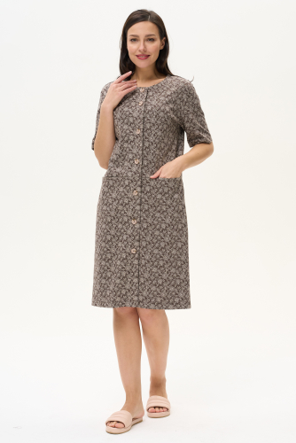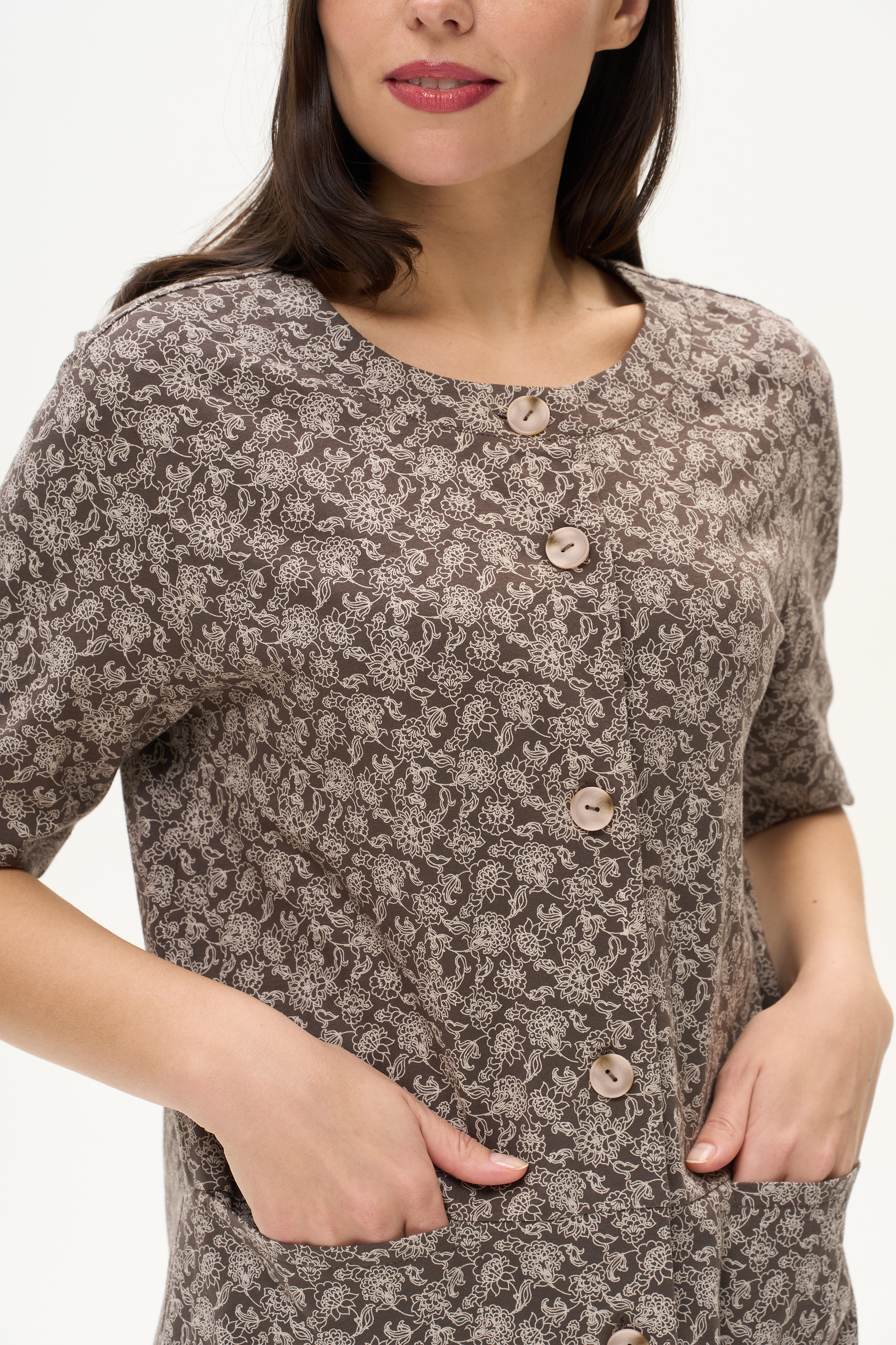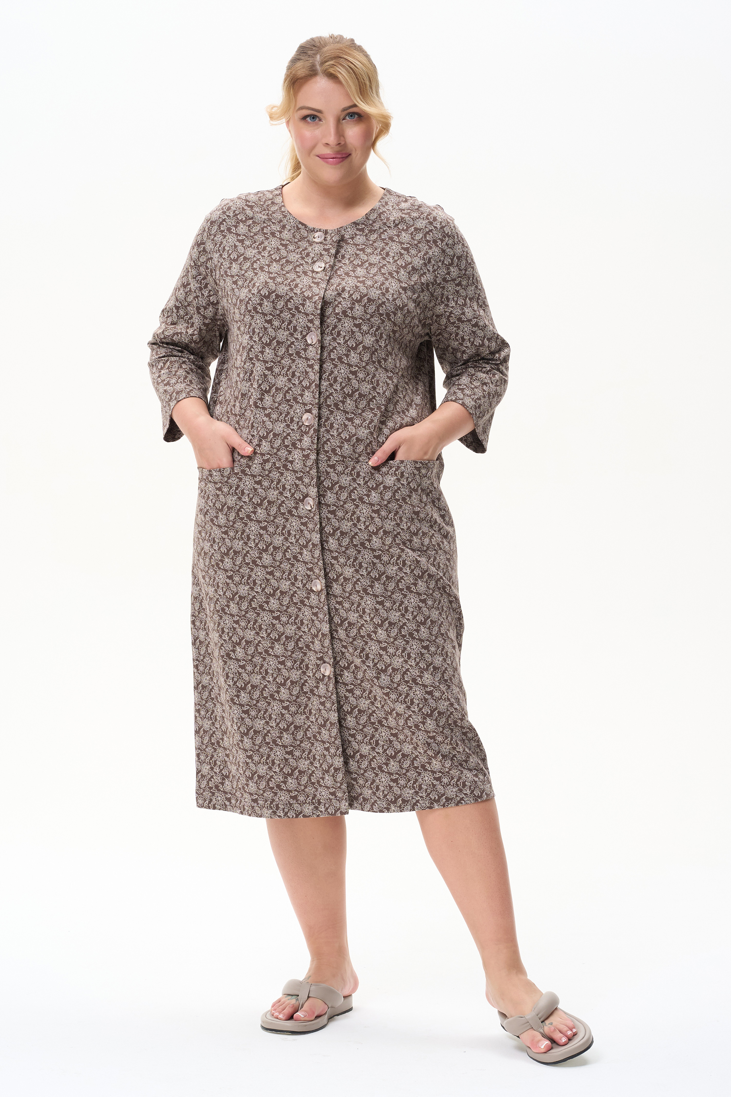 100% хлопок Халат прямого силуэта из хлопкового трикотажного полотна. Круглый вырез горловины, центральная застежка на пуговицы, В подрезах полочки карманы. Втачные рукава 3/4. Длина изделия ниже колена. Рост модели на фото 175 см.