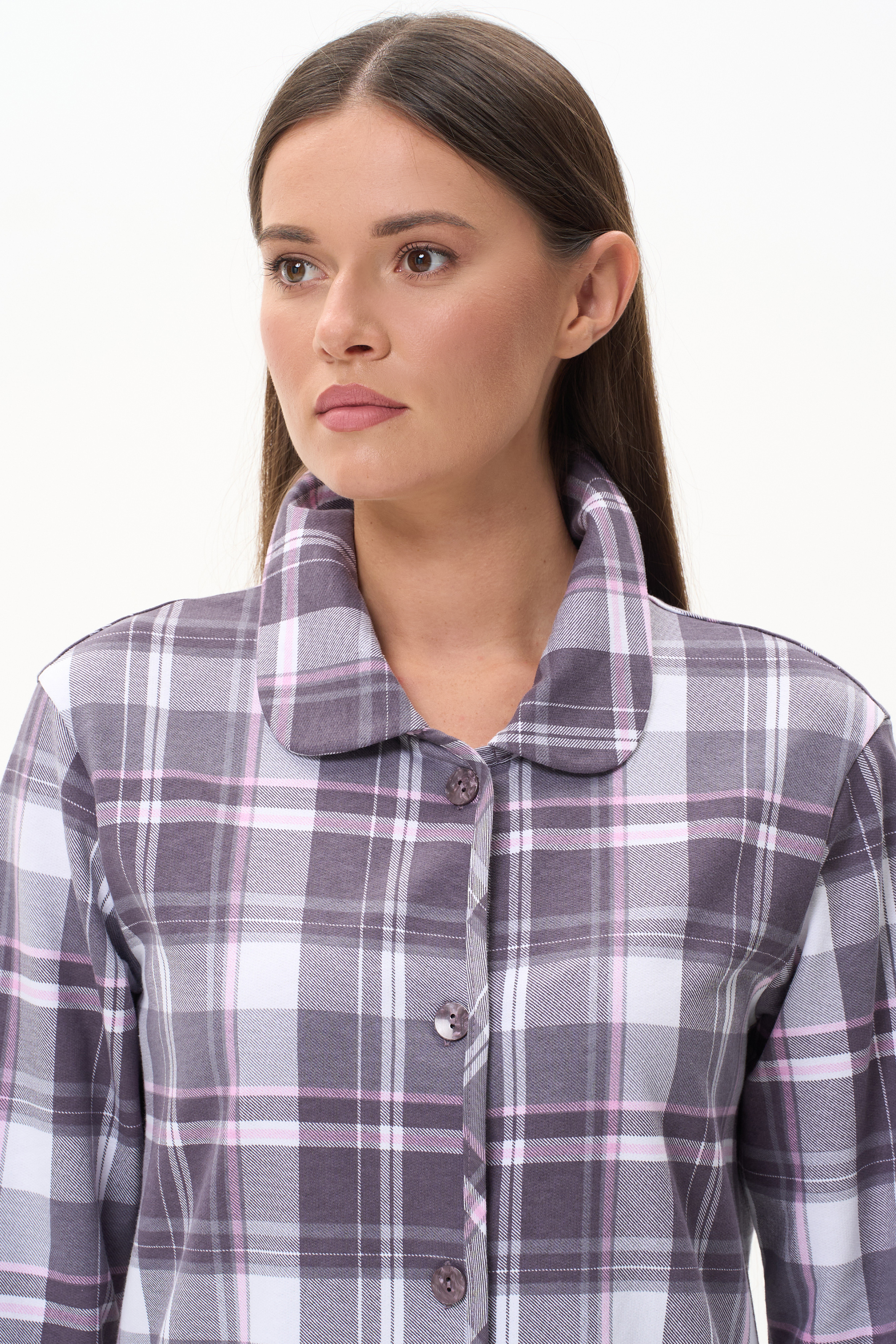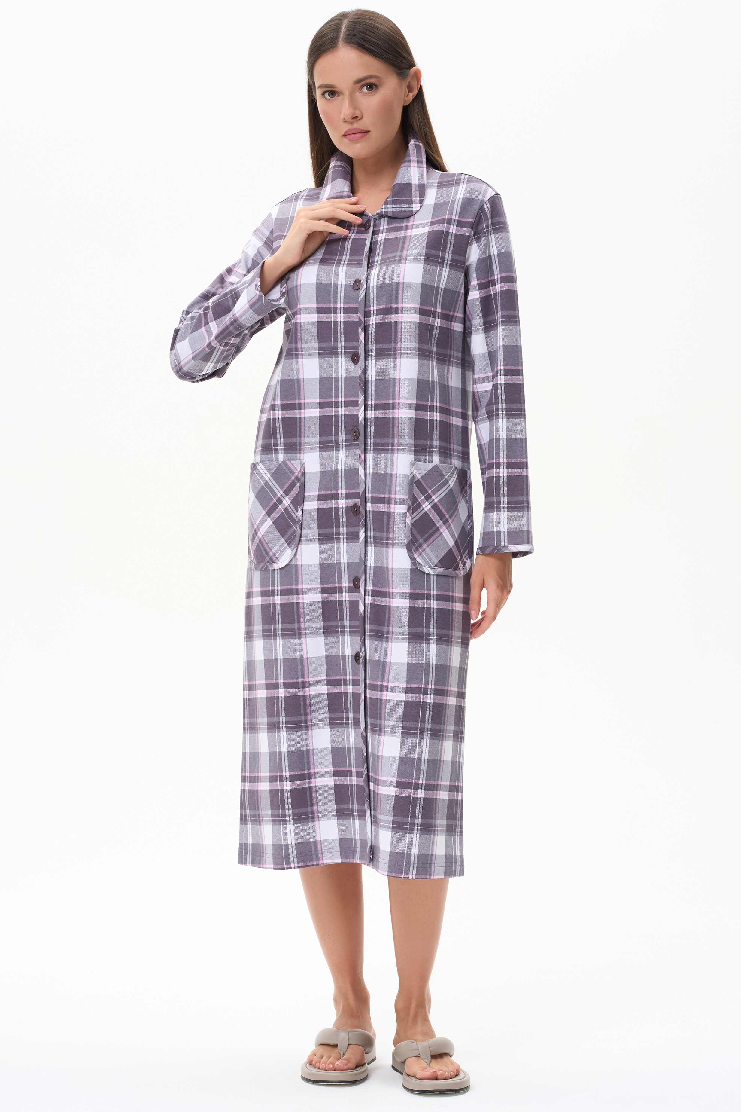 100% хлопок Тёплый халат из хлопкового трикотажного футера с начёсом. Элегантный отложной воротник, длинные втачные рукава. Застёжка на пуговицы, накладные карманы. Длина изделия ниже колена. Рост модели на фото 178 см.