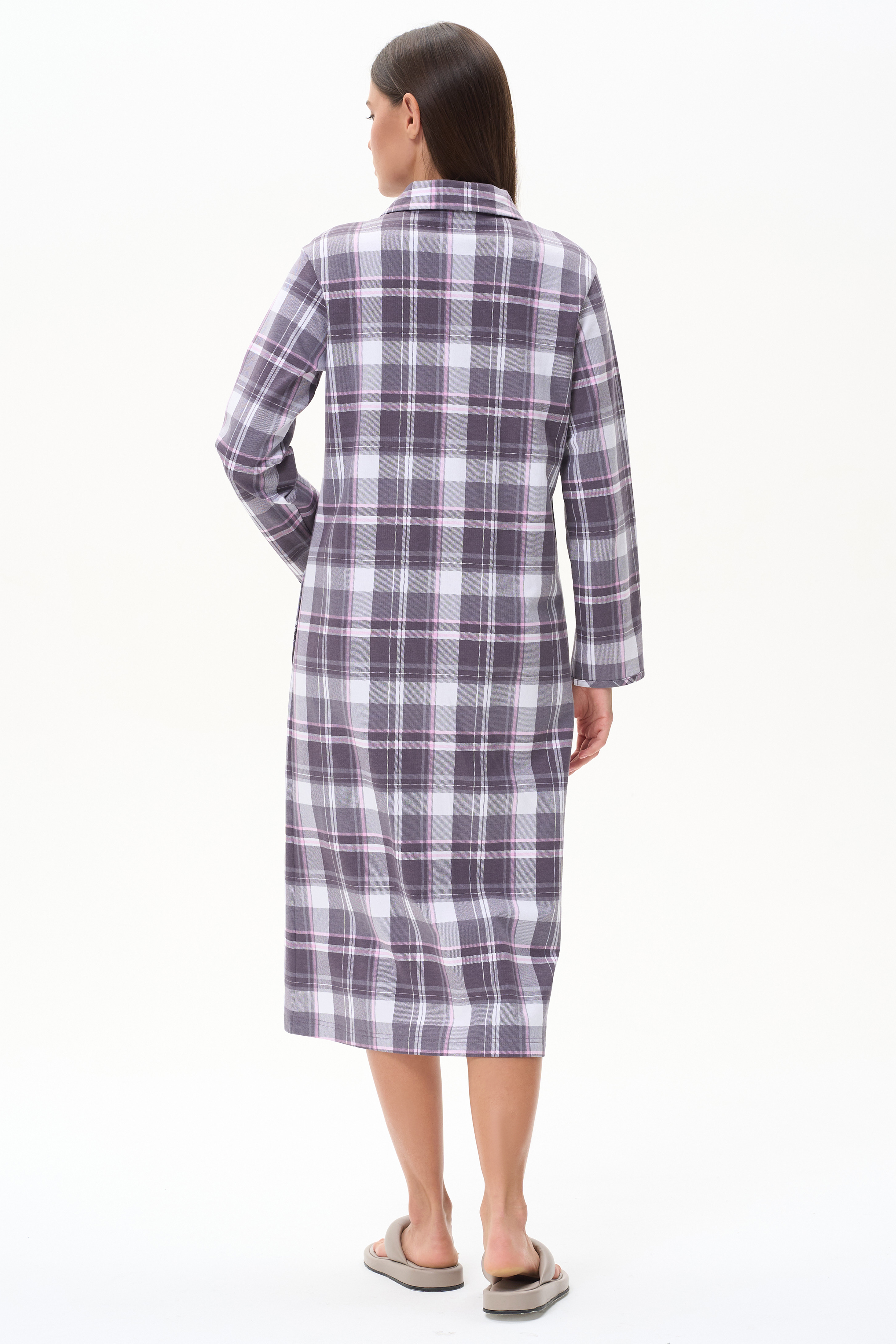 Тёплый халат из хлопкового трикотажного футера с начёсом. Элегантный отложной воротник, длинные втачные рукава. Застёжка на пуговицы, накладные карманы. Длина изделия ниже колена. Рост модели на фото 178 см.