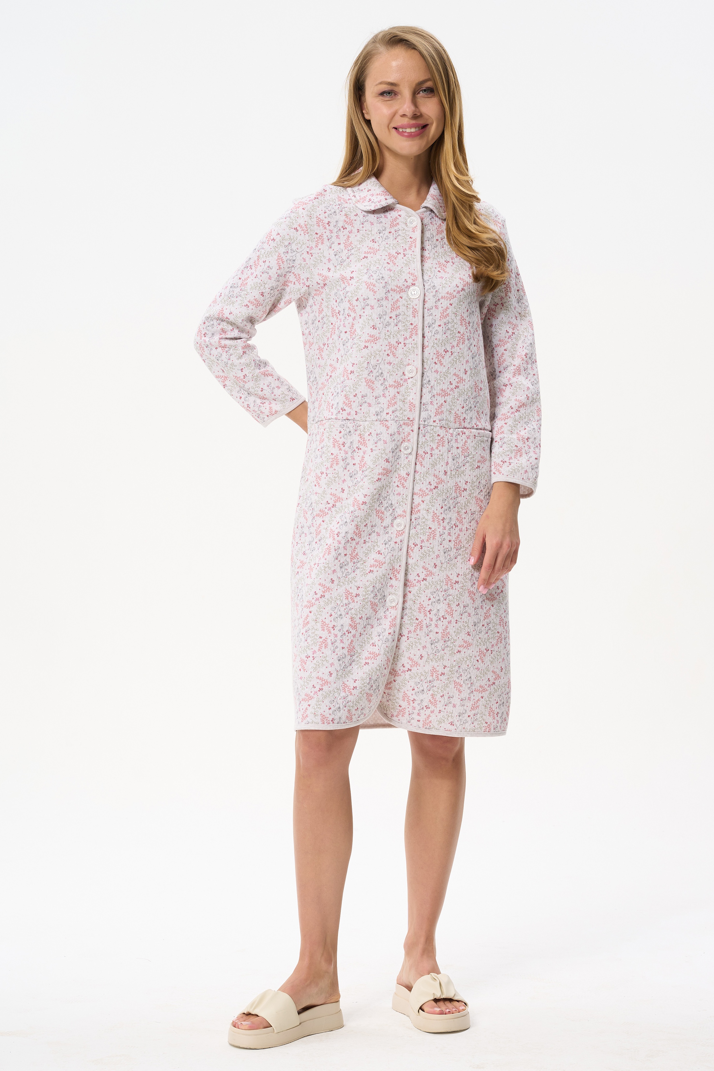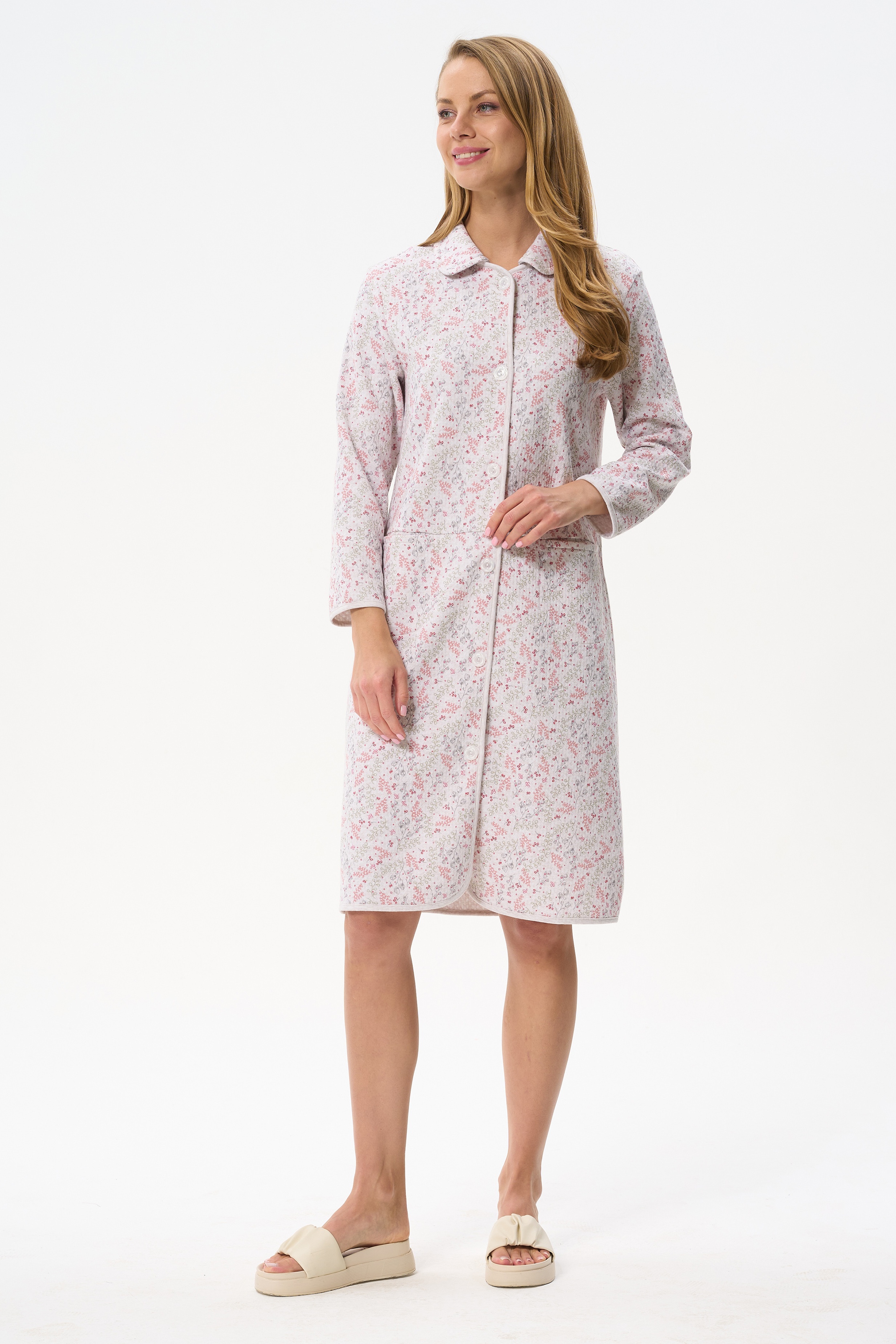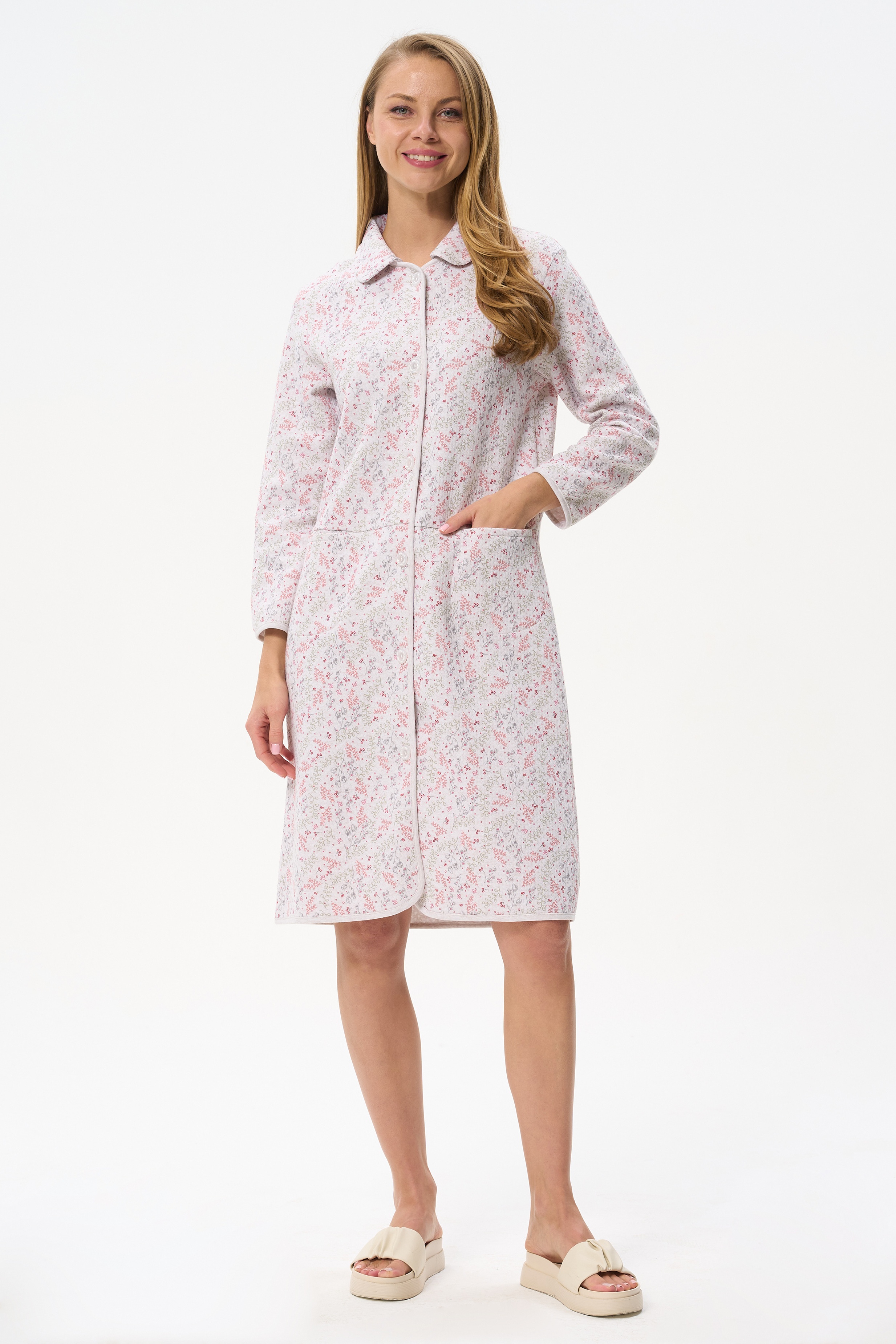 80% хлопок/ 20% полиэстер Халат из хлопкового полотна - капитоний. Отложной воротник, центральная застежка на пуговицы, в подрезах полочки - карманы. Длинные втачные рукава. Длина изделия чуть ниже колена. Рост модели на фото 178 см.