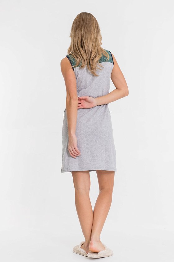 Молодёжный халат без рукавов выполнен из хлопковой ткани двух контрастных расцветок. Центральная застёжка на пуговицы, кокетка и планки на карманах из отделочного полотна. Карманы украшены декоративными бантиками.