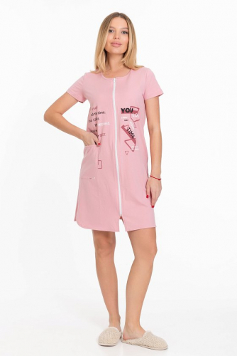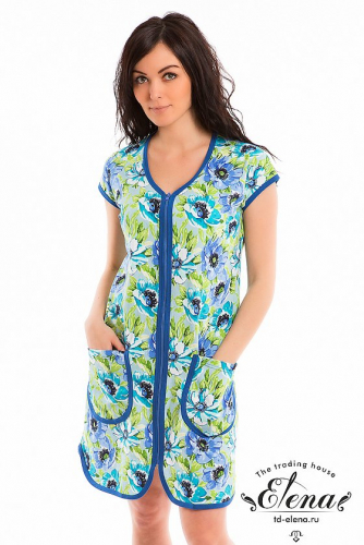 Халат женский укороченный, выполнен из набивной хлопковой ткани. Рукав цельнокроеный, горловина имеет V- образный вырез, центральная застёжка на молнию. Спереди расположены два накладных кармана. В качестве отделки бейка из однотонного полотна контрастного цвета.
