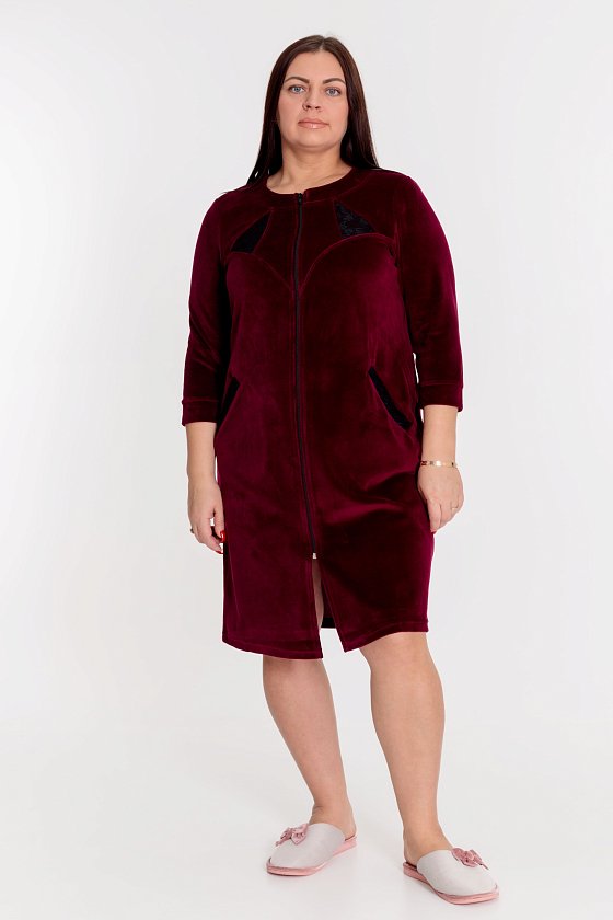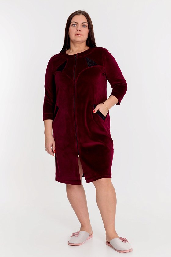 Халат из однотонного велюра с рукавом длиной 3/4, центральной застежкой на молнию и карманами. На планках карманов и средней части фигурной кокетки настрочено кружево. По горловине полочки притачная планка. Рукава с притачной манжетой.