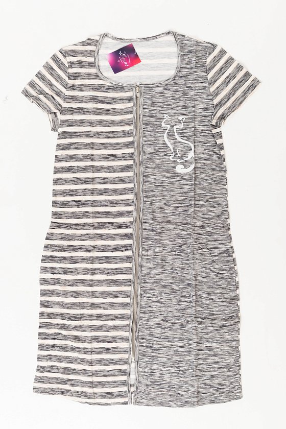 Халат на молнии выполнен из х/б полотна. Рукава короткие, на левой полочке нанесён принт. В боковых швах размещены карманы.