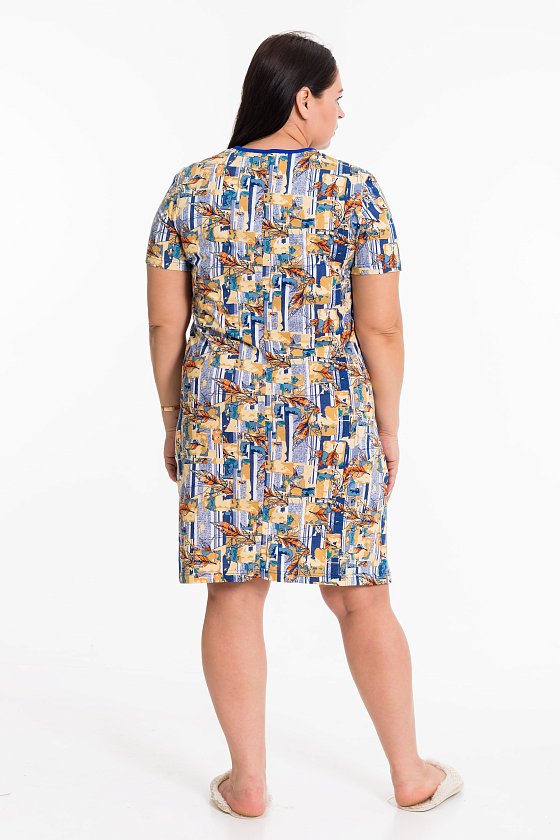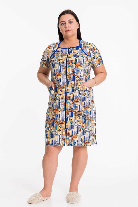 Халат выполнен из х/б полотна с набивкой. Застёжка на молнию, по бокам расположены карманы. Горловина обработана контрастной по цвету бейкой.