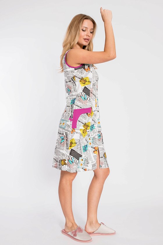 Халат без рукавов с центральной застёжкой на молнию. По бокам расположены два накладных кармана. Горловина, проймы и карманы обработаны бейкой из контрастного по цвету полотна.