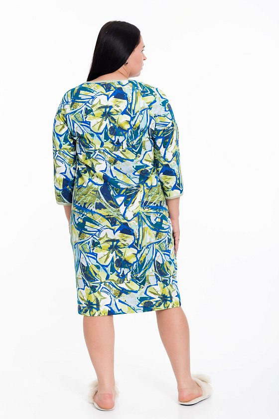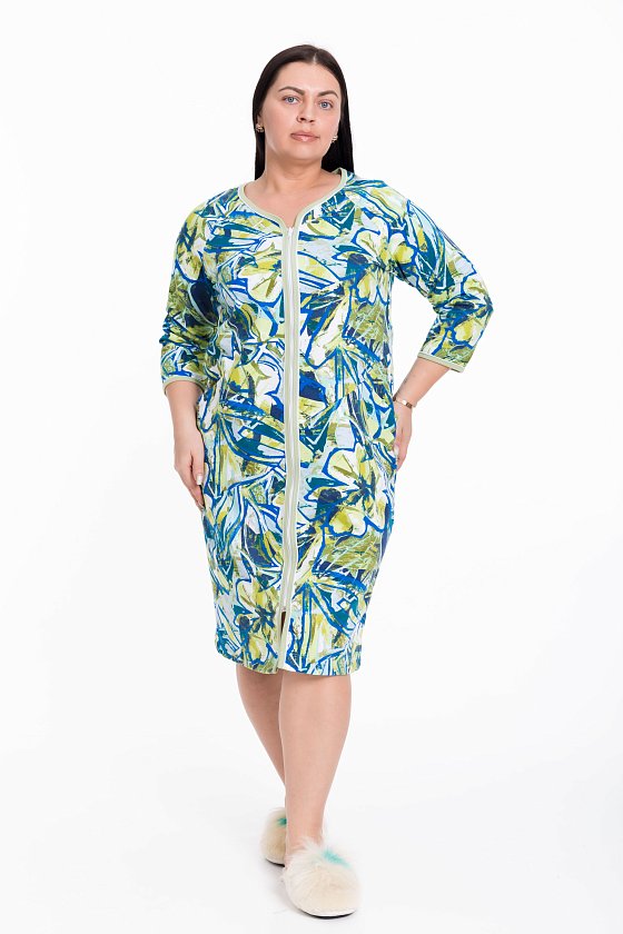 Женский халат из футера 2х нитки с начесом - отличный выбор для домашнего отдыха. Прямой крой и рукав-реглан 3/4 обеспечат комфортную посадку. Фигурный вырез горловины добавляет изящества и элегантности к халату, а обработка бейкой с белым кантом придает изделию законченный вид.