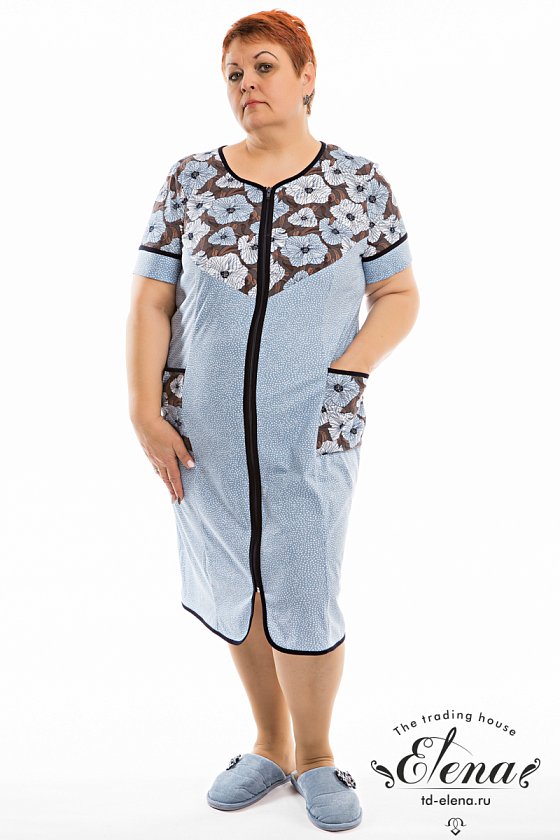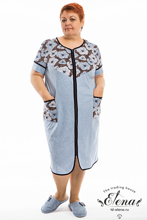 Халат женский выполнен из кулирки, 100% хлопок. С коротким втачным рукавом и застёжкой на молнию. Отделкой халата являются кокетки на полочках, карманы и рукава из полотна-компаньона, а так же бейка контрастного цвета.