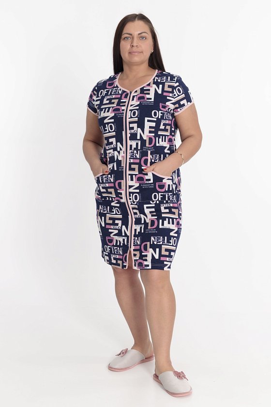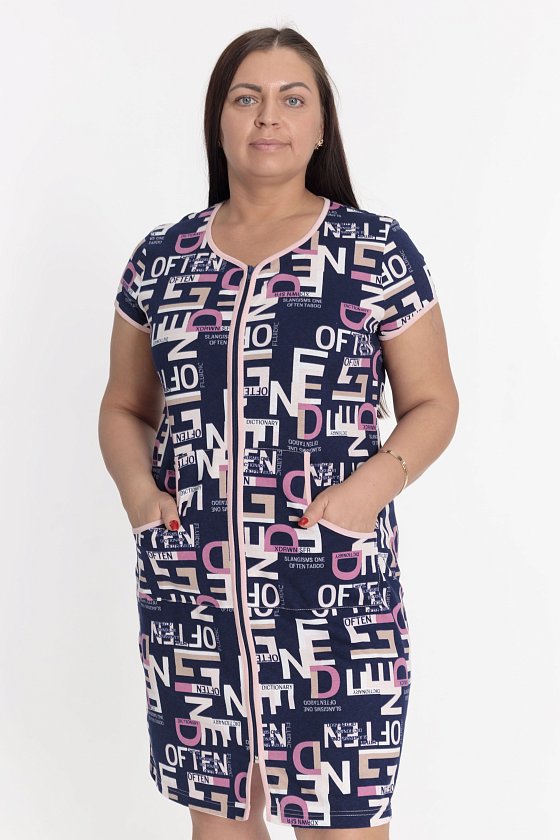 Халат выполнен из х/б полотна с набивным рисунком. Спереди застёжка на молнию и карманы. Горловина, низ рукавов, борта и вход в карманы обработаны бейкой контрастного цвета.