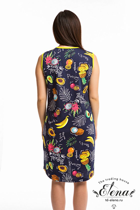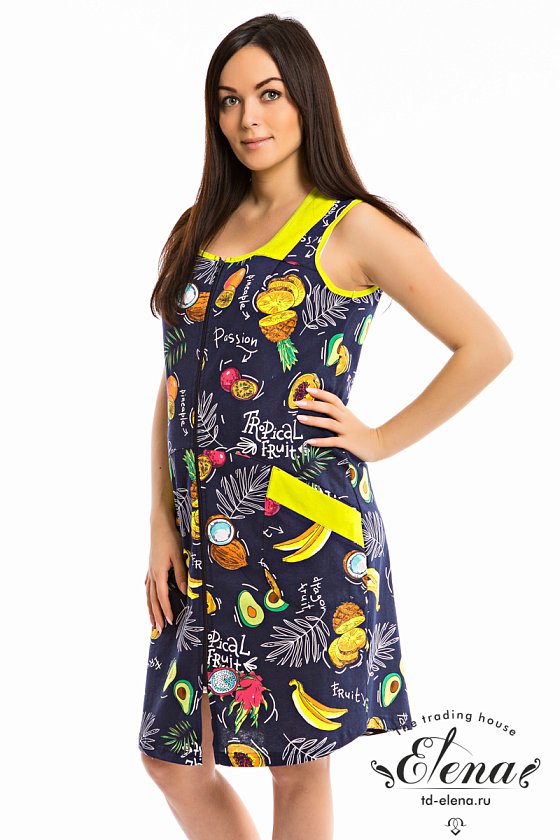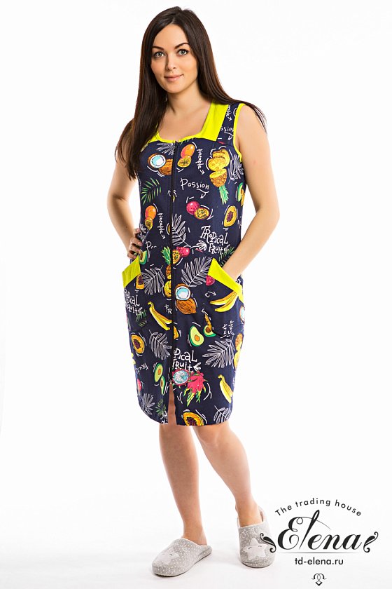 Халат выполнен из хлопкового полотна с набивным рисунком с отделкой деталями из однотонного полотна. Халат без рукавов, с центральной застёжкой на молнию. Спереди размещены два накладных кармана.