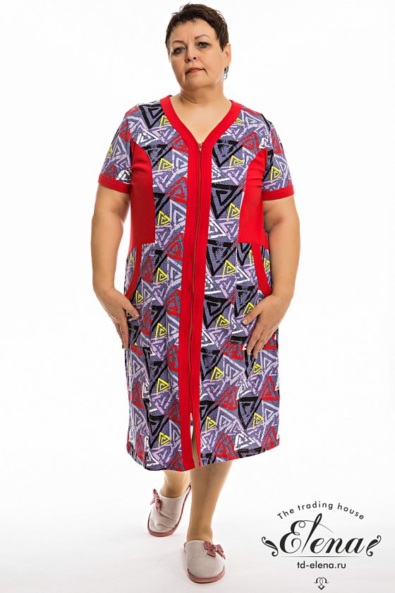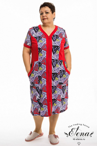Халат выполнен из кулирки с набивным рисунком со вставками из однотонного отделочного полотна. Рукава короткие, втачные. Спереди расположены накладные карманы, центральная застёжка на молнию.