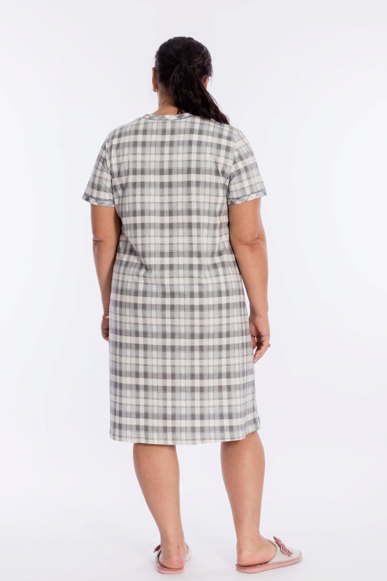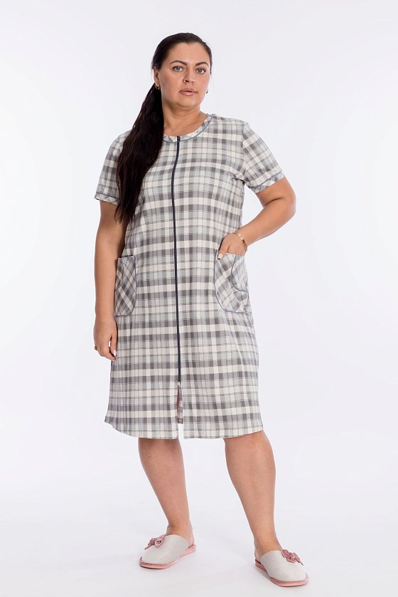 Халат с застёжкой на молнию выполнен из кулирки, 100% хлопок. Рукава короткие, спереди два накладных кармана. Вырез горловины, низ рукавов и карманы украшены отделочным кантом.
