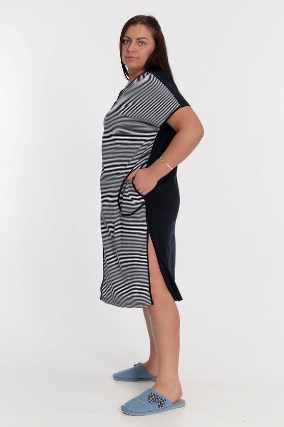 Халат выполнен из кулирки, 100% хлопок. Халат свободного силуэта, линия плеча спущена, спереди застёжка на молнию. По бокам расположены карманы. Детали халата оформлены бейкой, в боковых швах разрезы.