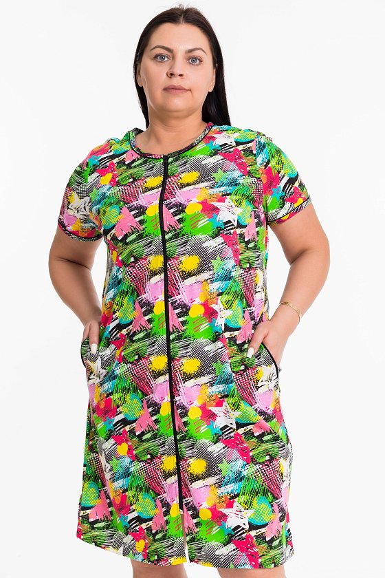 Женский халат — отличный выбор для домашнего отдыха. Халат изготовлен из мягкой и приятной к телу ткани — кулирки реактив с набивным рисунком. Центральная застёжка на молнию и боковые карманы делают эту модель функциональной, а разрезы по бокам обеспечивают свободу движений. Круглый вырез горловины, низ рукавов и вход в карманы обработаны бейкой из основного полотна с кантом белого цвета, что придает изделию оригинальность. Изготовленный из натуральной ткани, халат обеспечит комфорт в течение всего дня.