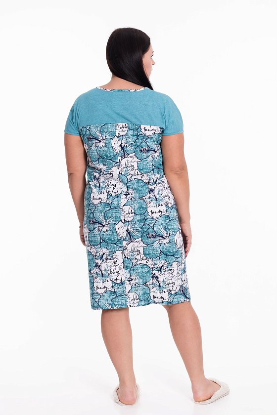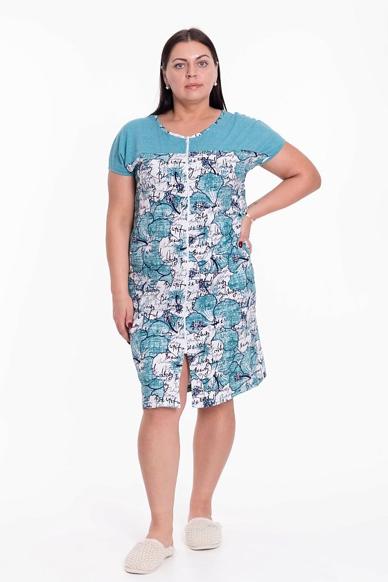 Халат для женщин выполнен из хлопкового полотна двух цветов-компаньонов. Линия плеча спущена, горловина и вход в карманы обработаны бейкой, застежка на молнию.