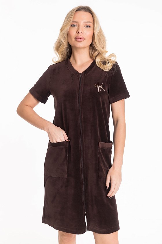 Халат имеет прямой крой и застёгивается на замок. V-образный вырез горловины придаёт изделию стильный вид. Короткий рукав обеспечивает свободу движений.
