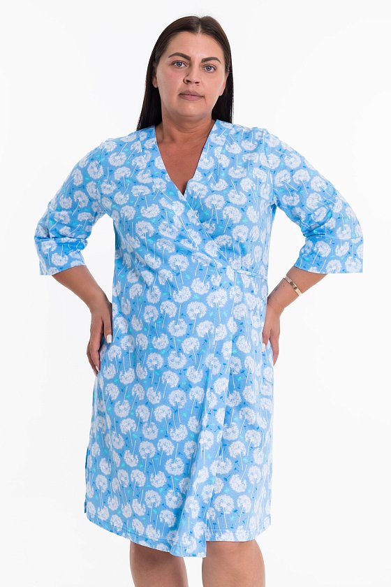 Халат выполнен из хлопкового полотна. Рукава длиной 3/4, полочки запахиваются и завязываются на пояс. По бокам есть карманы.