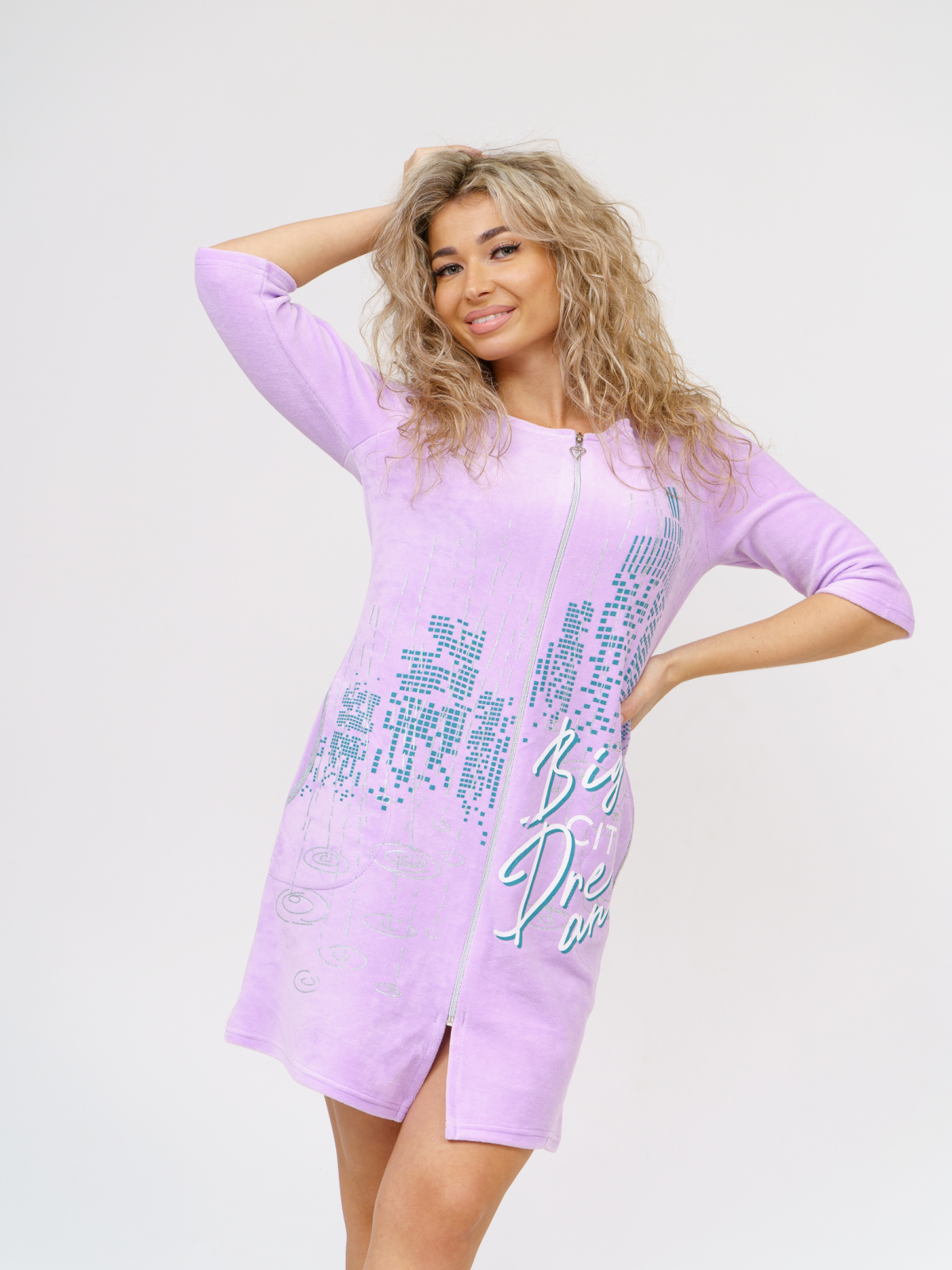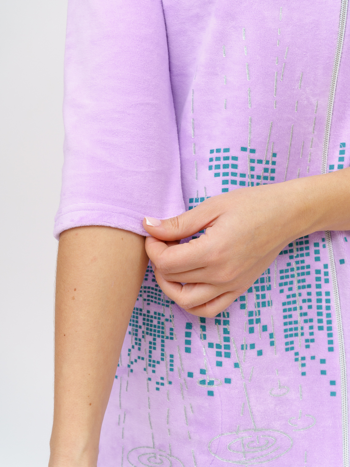 Халат женский создан из велюра высокого качества - отличный выбор для тех, кто больше всего ценит нежность материала и приятную на ощупь текстуру. Благодаря идеальным лекалам подходит под любой тип фигуры от 44 до 54 размера. Нарядный и удобный домашний халат средней длинны на молнии, круглый неглубокий вырез, рукава длиной 3/4. Украшением этой модели стал эксклюзивный принт. Этот женственный и нежный наряд подарит ощущение роскоши и уюта своей обладательнице. В этом халате приятно не только окунуться в мир спокойствия и домашнего уюта, он идеально подойдет для встречи гостей.