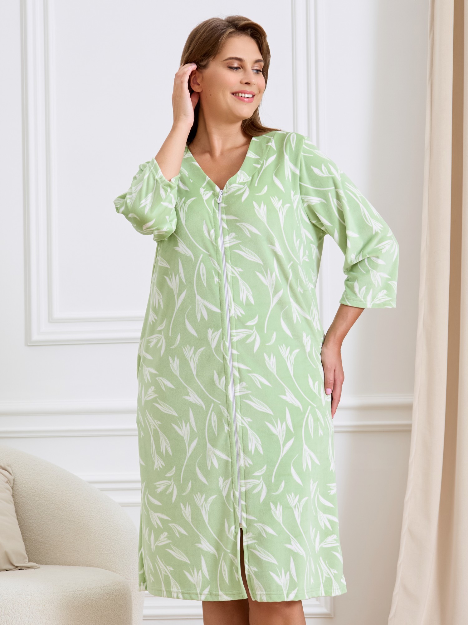 Халат женский из трикотажного полотна «велюр» с набивным рисунком, прямого силуэта, с втачными рукавами ¾ длины, горловиной обработанной втачной планкой фигурной формы, с карманами в боковых швах, центральной бортовой застежкой на тесьму «молния».