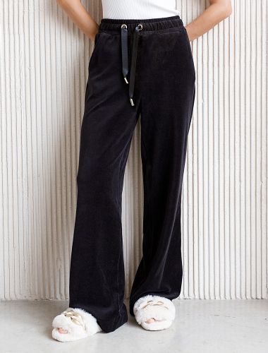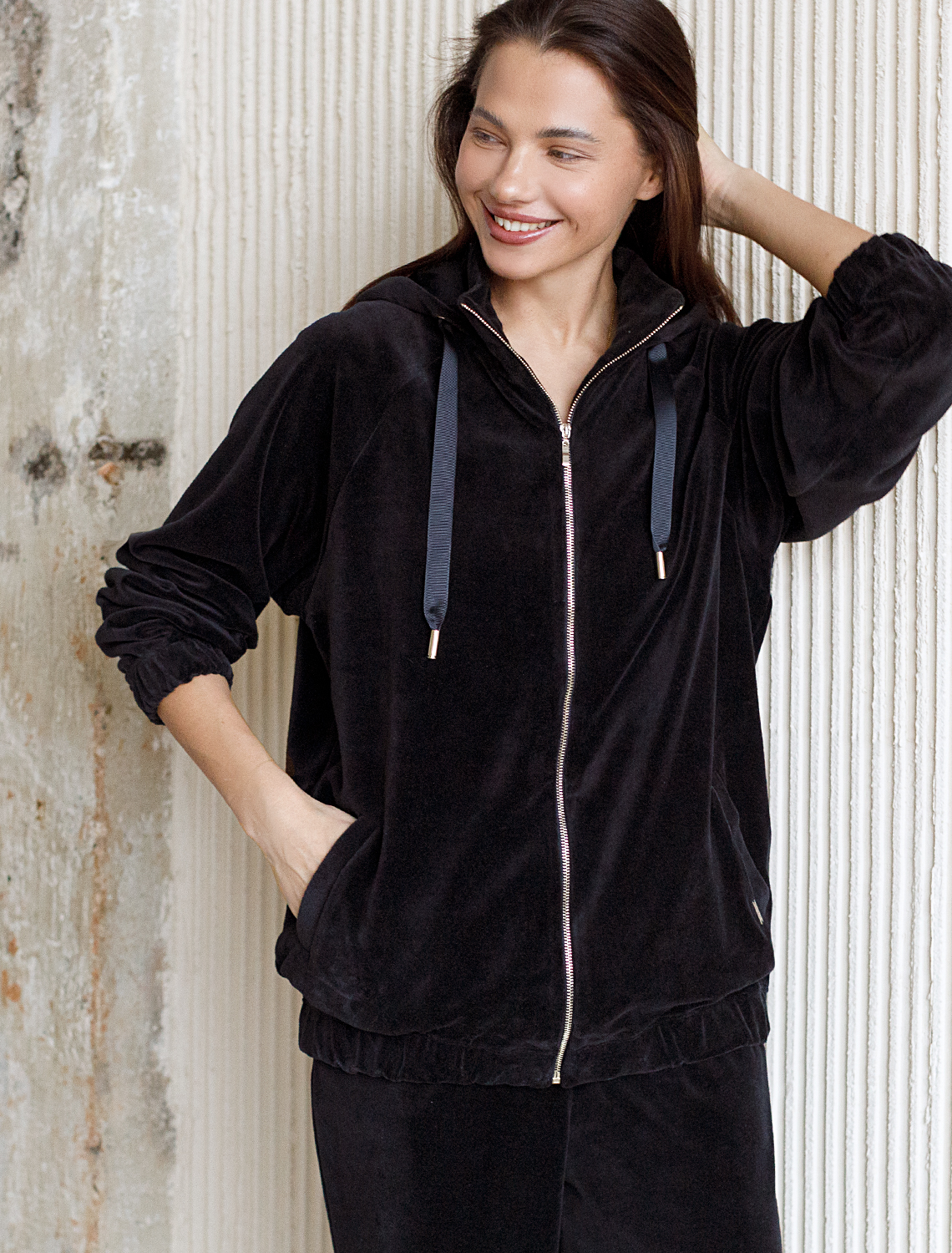 Худи на двухсторонней молнии выполнено из бархатистого велюра. Модель дополнена резинкой по низу и боковыми карманами. Легкий и мягкий материал с матовой фактурой придает изделию нежность и комфорт. Хорошо держит тепло и форму – идеальное решение для домашнего отдыха. Сочетается в костюме с брюками D44.117 черный