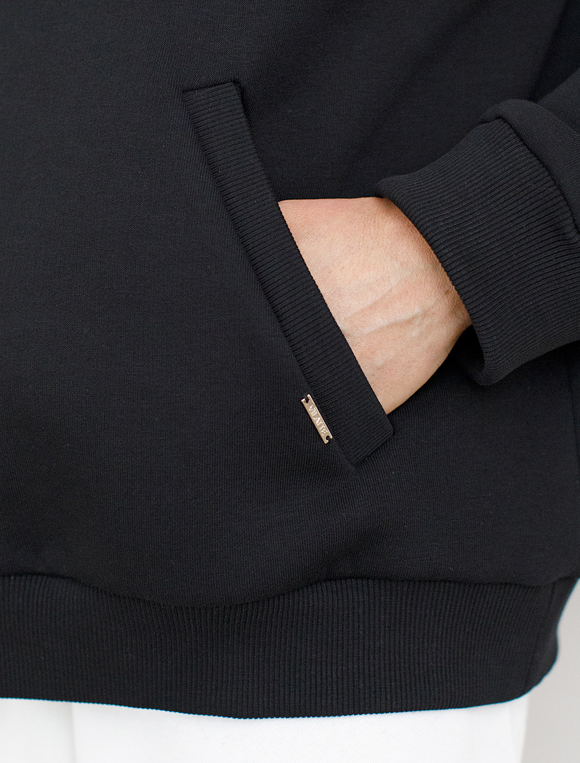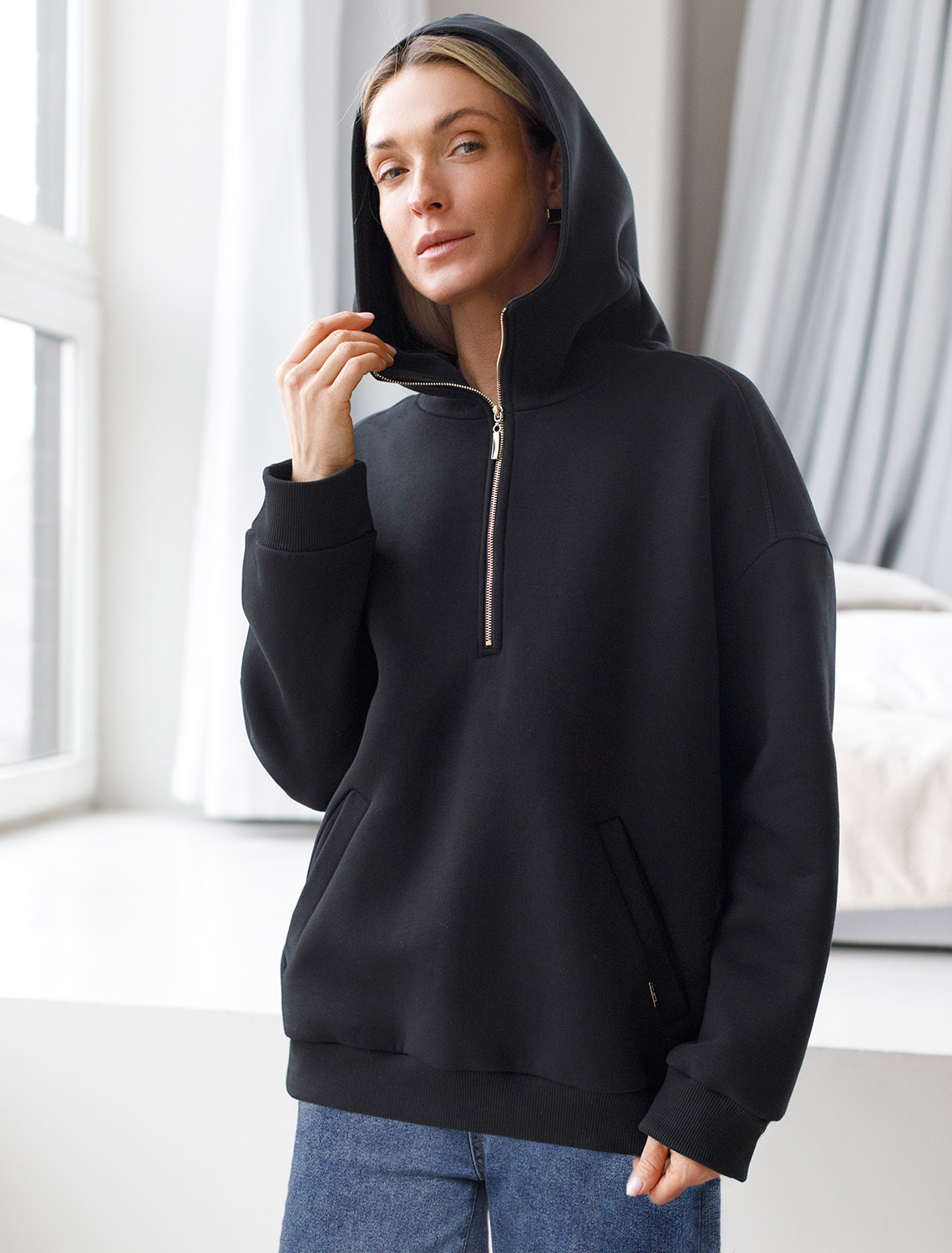 Худи с воротом на молнии выполнено из премиального футера трехнитки с теплым начесом. Модель дополнена боковыми карманами и золотистой фурнитурой, что поддерживает актуальный стиль спорт-шик. Свободный крой подходит для любой фигуры. Ранней осенью или поздней весной можно носить в качестве верхней одежды. черный