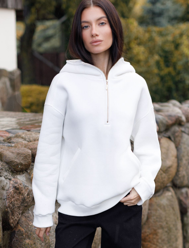 Худи с воротом на молнии выполнено из премиального футера трехнитки с теплым начесом. Модель дополнена боковыми карманами и золотистой фурнитурой, что поддерживает актуальный стиль спорт-шик. Свободный крой подходит для любой фигуры. Ранней осенью или поздней весной можно носить в качестве верхней одежды.