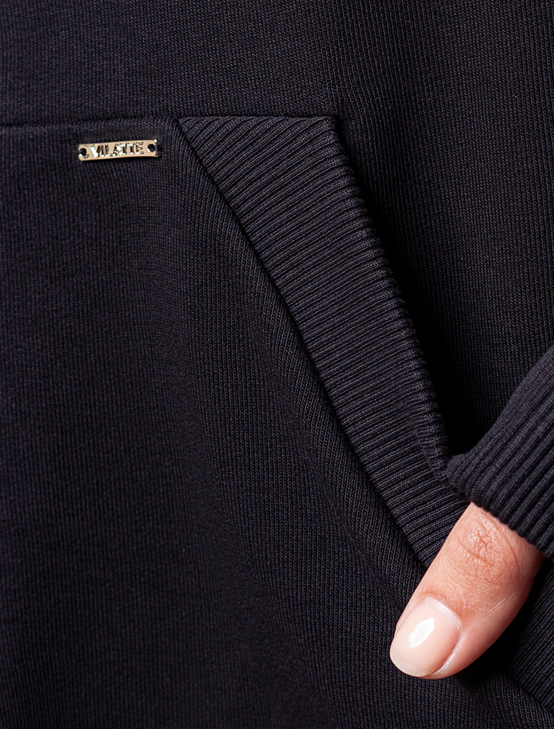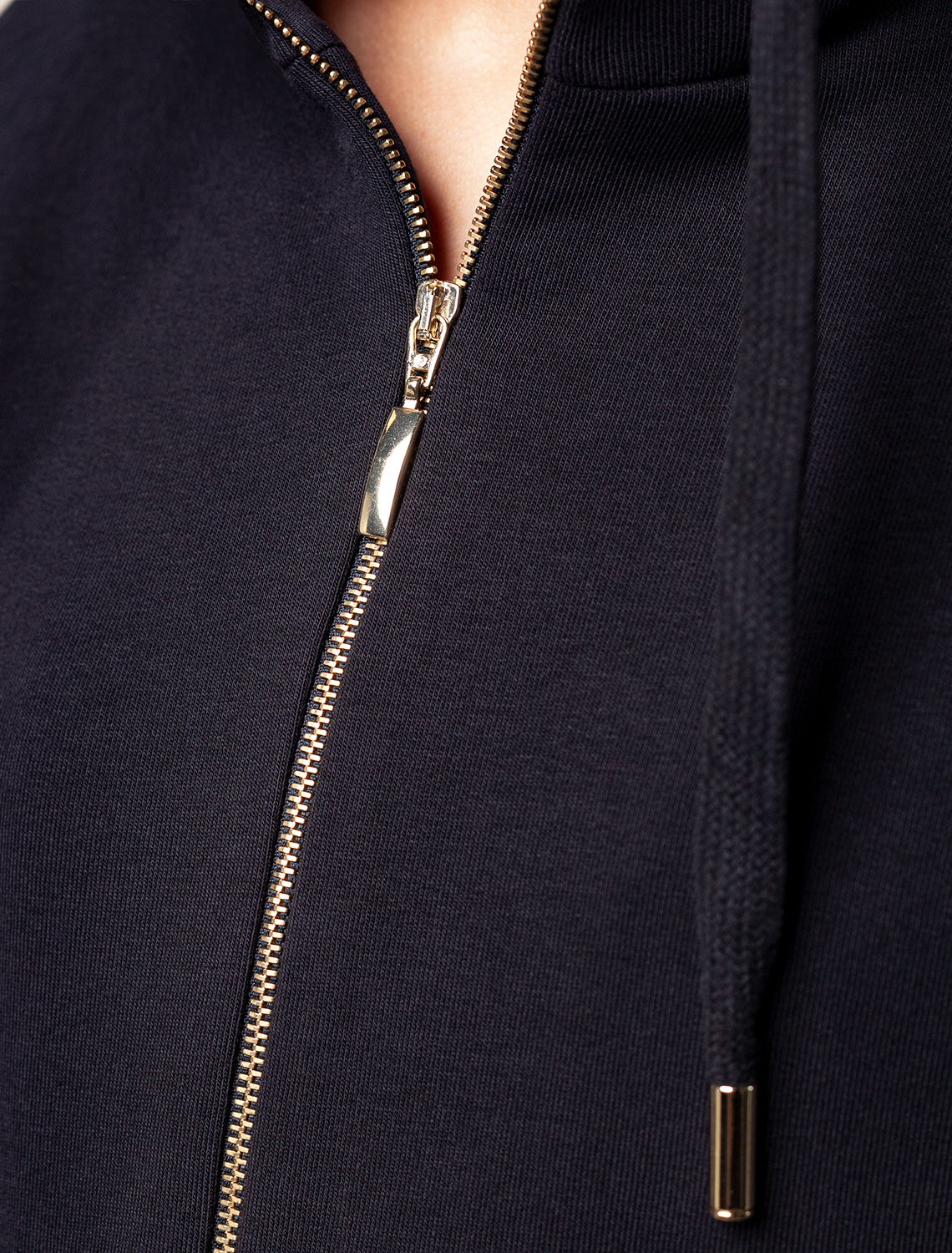 Худи на молнии с золотистой фурнитурой выполнено из премиального футера трехнитки без начеса. Изделие украсили принтом в виде логотипа бренда. Мягкий и уютный трикотаж с добавлением эластана гарантирует абсолютный комфорт даже в прохладное время года, не ограничивая свободу движений. Модель сочетается в костюме с брюками D44.079 и D44.089 черный