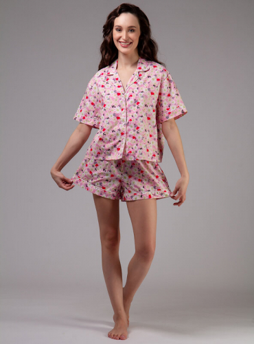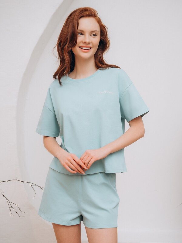 Пижама женская изготовлена из хлопкового трикотажа и выполнена в бирюзовом цвете. Она состоит из футболки и шорт. Футболка прямого кроя имеет короткие рукава и округлый вырез. На груди сбоку вышита надпись. Шорты имеют на талии мягкую эластичную резинку, украшенную декоративной этикеткой спереди.