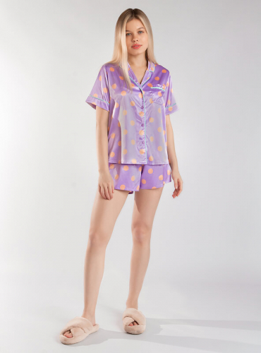 Домашняя пижама от торговой марки Индефини. В комплекте футболка с леггинсами. Футболка из бамбука, лососевого цвета, с принтом, с короткими рукавами, укороченная, с декоративной сборкой спереди, свободного кроя. Леггинсы черного цвета, со вставками из микросетки, средней посадки.