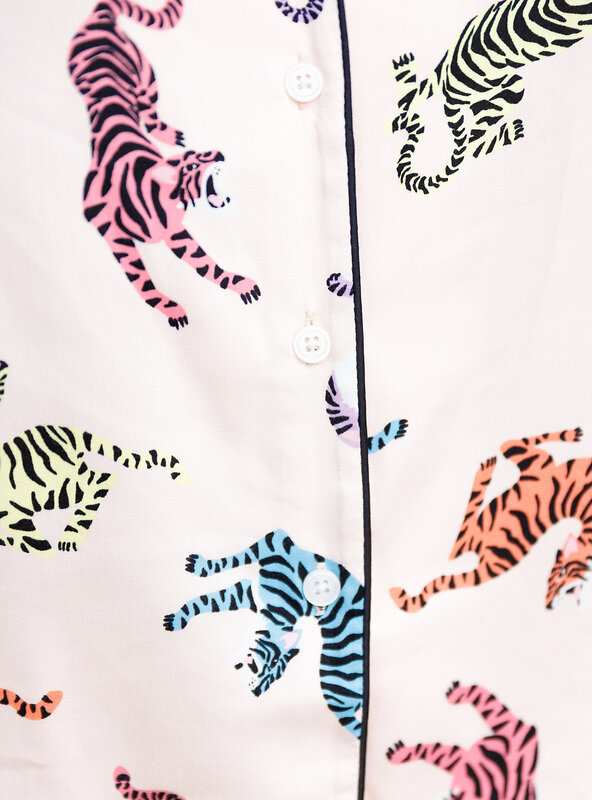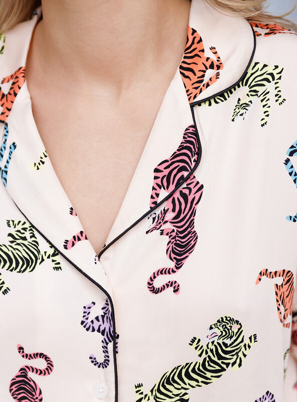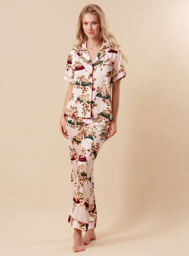 Женская пижама из вискозного материала отлично поглощает  влагу и пропускает воздух. Пижама включает в себя футболку свободного кроя с короткими рукавами и отложным воротником. В комплекте также есть штаны на мягкой резинке. Украшением пижамы является разноцветный анималистичный принт.