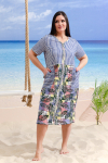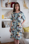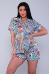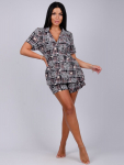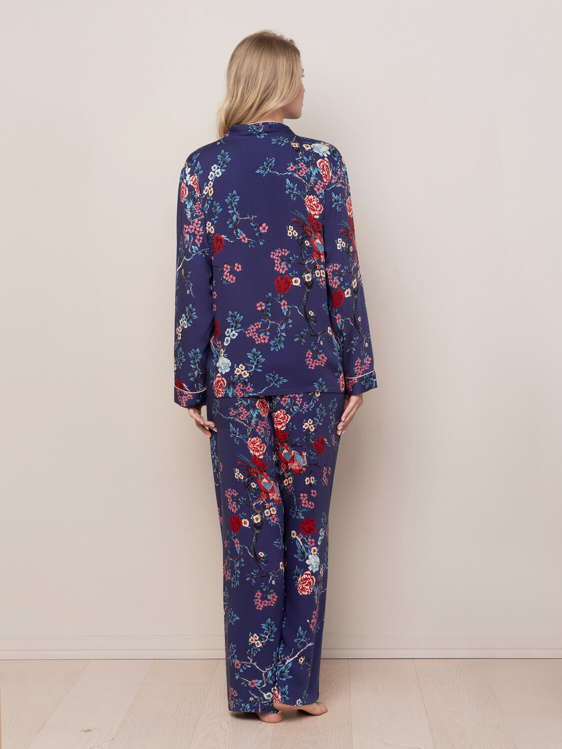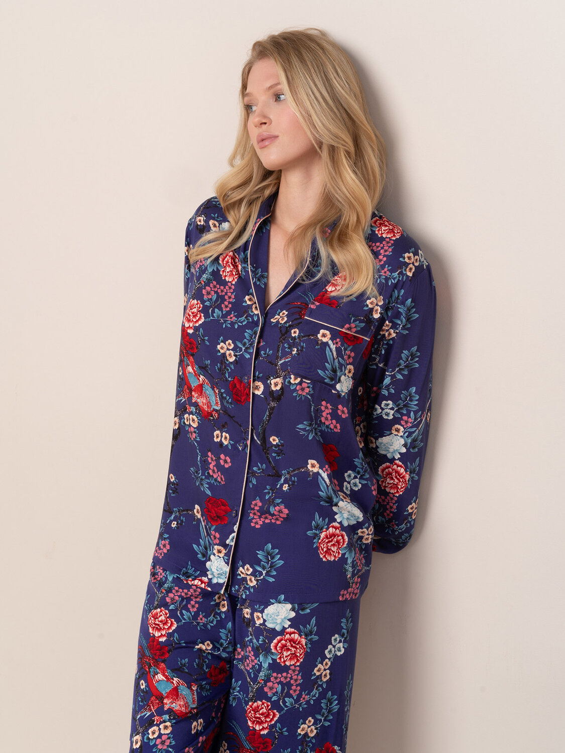 Женская пижама, изготовленная из вискозы, приятно прилегает к телу, даря ощущение мягкости и легкости. Верх пижамы с длинными рукавами, отложным воротником и нагрудным карманом обеспечивает классический, но изысканный вид. Застёжка на пуговицах добавляет удобства и делает пижаму универсальной. Брюки на широкой эластичной резинке гарантируют удобную посадку на талии. Пижама украшена цветочным принтом, добавляющий свежести и женственности образу.