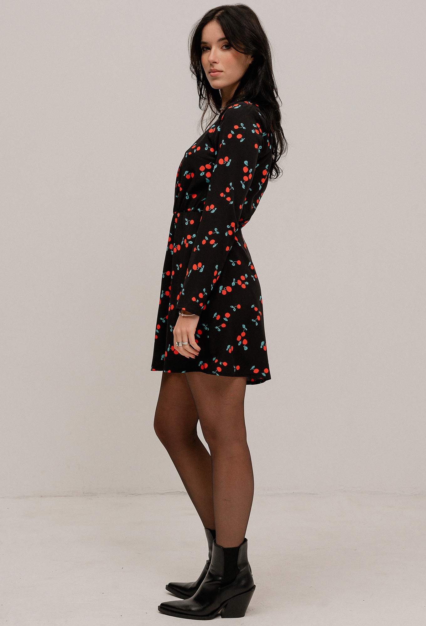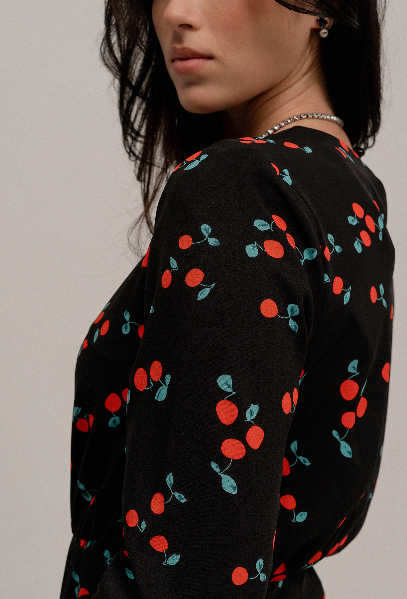 Платье женское из ткани шелк иск. с печатным рисунком на подкладке. Приталенного силуэта, рукав рубашечного типа длиной до запястья. Перед со сборкой по линии талии и по спинке по лифу. Отрезное по линии талии, с застежкой молнией в боковом шве спинки и на пуговицу и петельку по спинке.