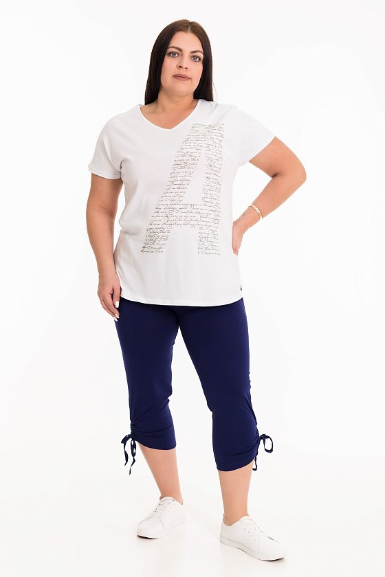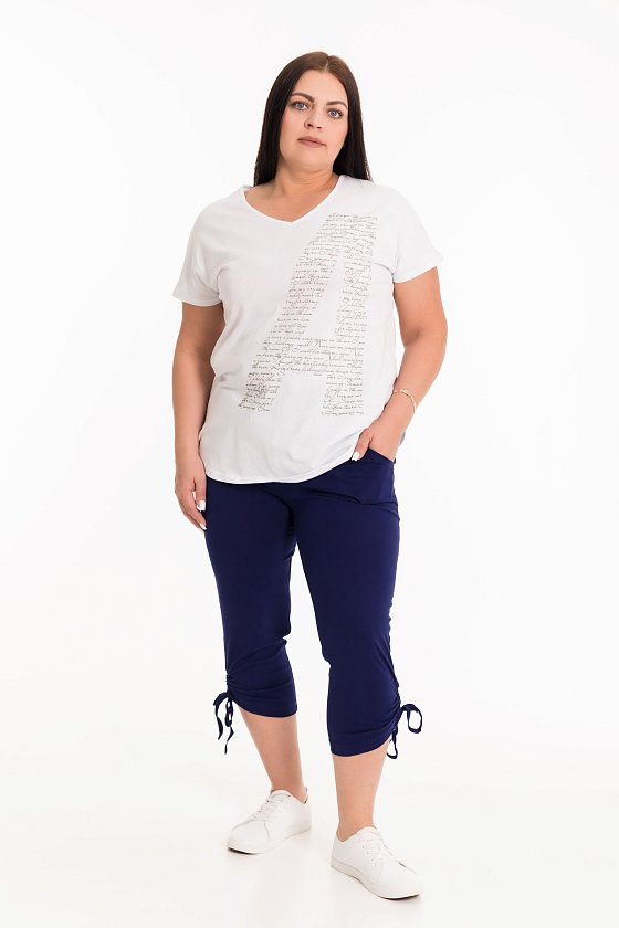 Капри женские выполнены из однотонной хлопковой ткани. Пояс на резине, спереди расположены карманы, по бокам внизу затягиваются при помощи шнурка.