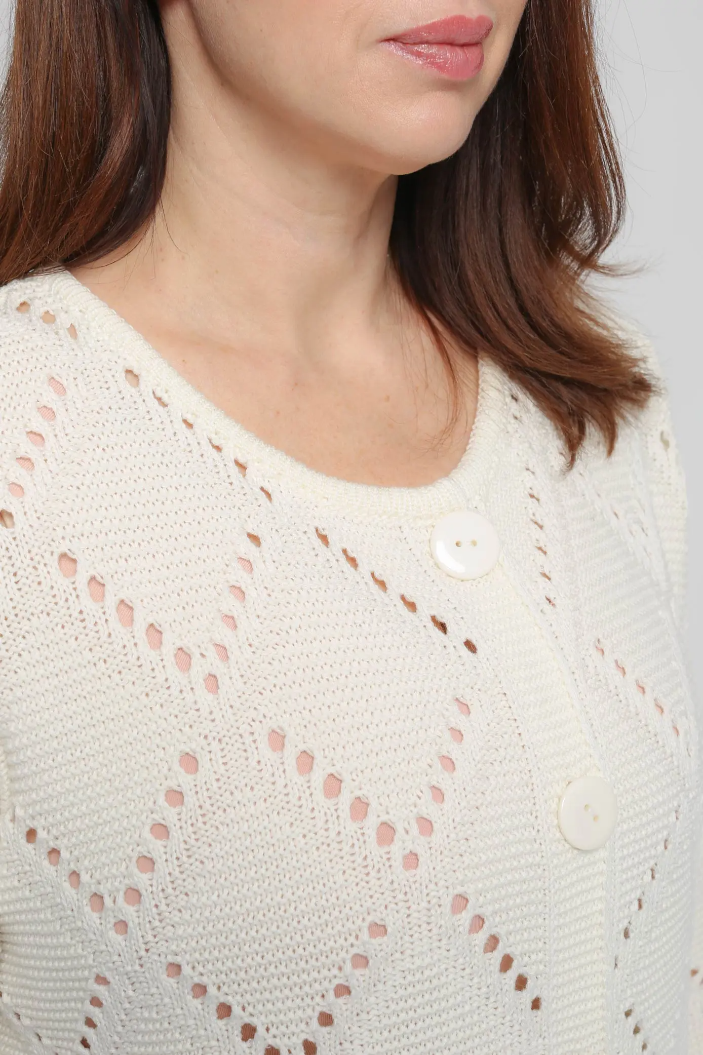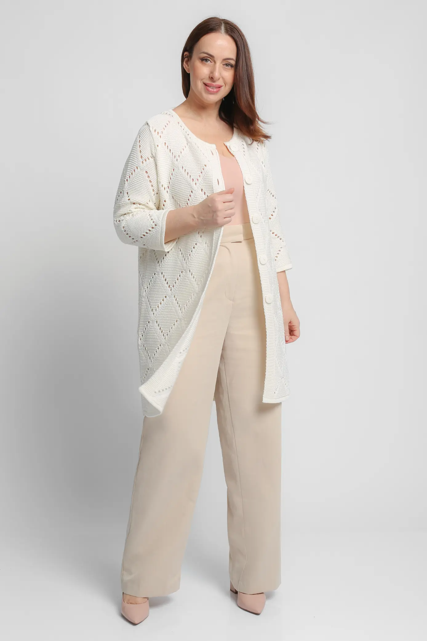 Кардиган женский вязаный, выполнен ажурной вязкой. Состав изделия включает в себя 50% хлопка. Кардиган прямого покроя,  застёгивается на пуговицы. Горловина изделия круглая, откетлевана узкой бейкой петля в петлю. Рукава втачные, свободного облегания 7/8.
