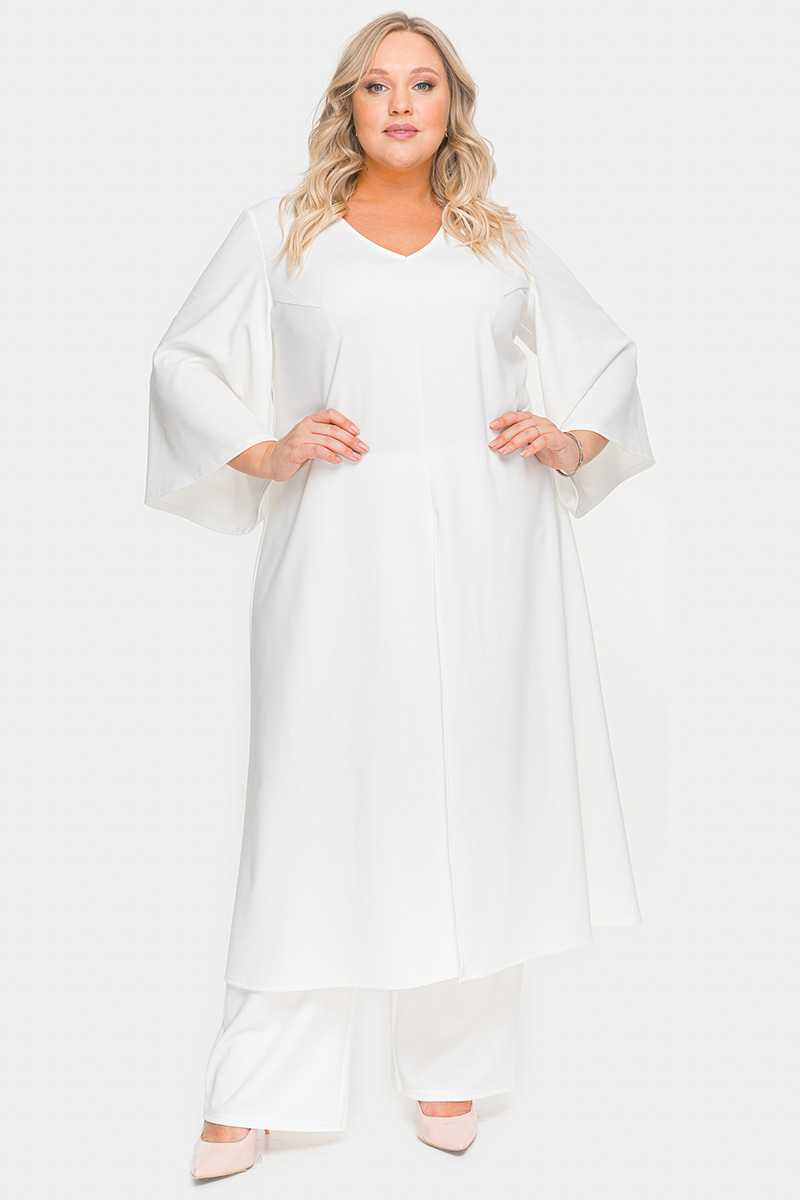 Удлиненный кардиган А-силуэта из крепа с эластаном. V-вырез горловины переда. По центральному шву переда разрез. Рукав расклешенный.
