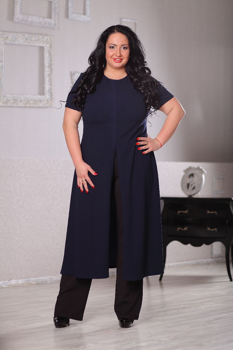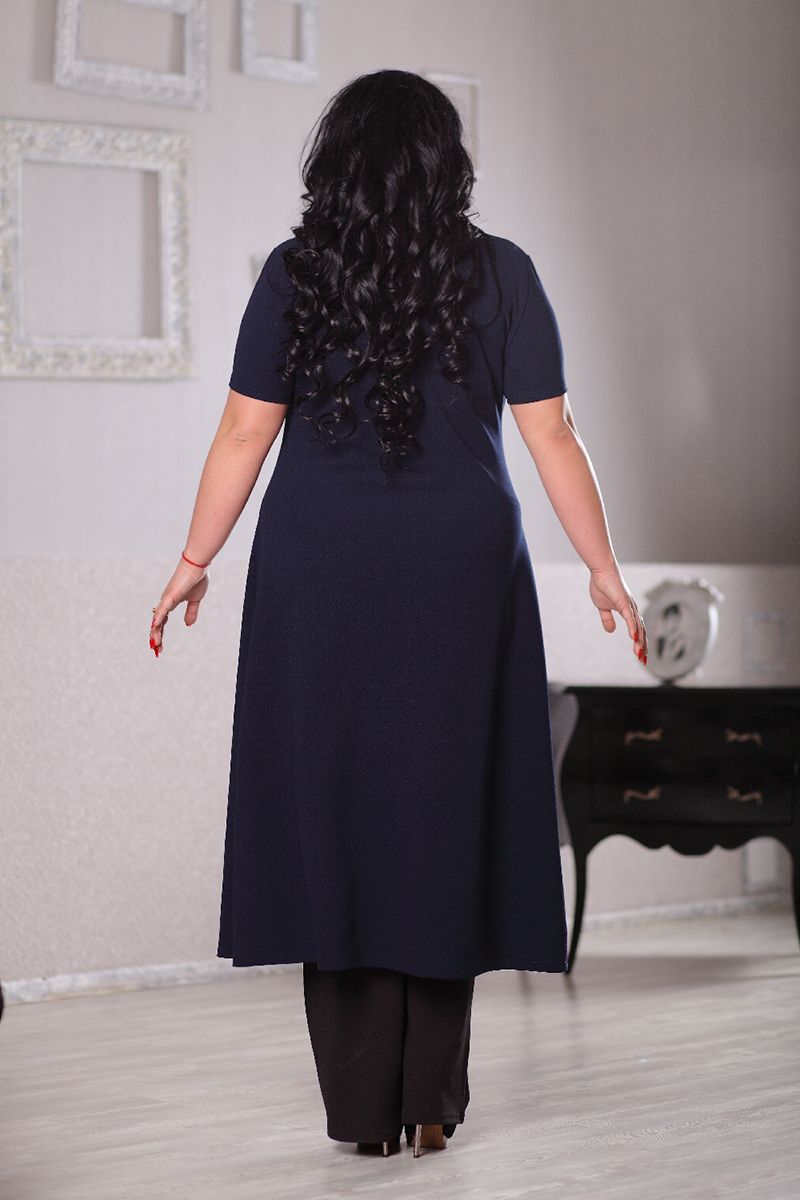 Удлиненный кардиган А-силуэта темно синего цвета из крепа. Кардиган станет прекрасным дополнением Вашего гардероба, т. к. сочетается с любым его элементом. В нем Вы будете чувствовать себя комфортно, а выглядеть стильно и неотразимо.