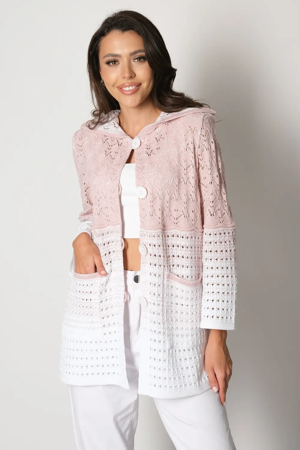 Ажурный удлиненный жакет полуприлегающего силуэта с капюшоном, застегивается на пуговицы. Рукава втачные длинной 7/8, немного расширены к низу. Два накладных кармана.  Жакет выполнен ажурным переплетением с переходом цвета от светлого к темному. пудровый