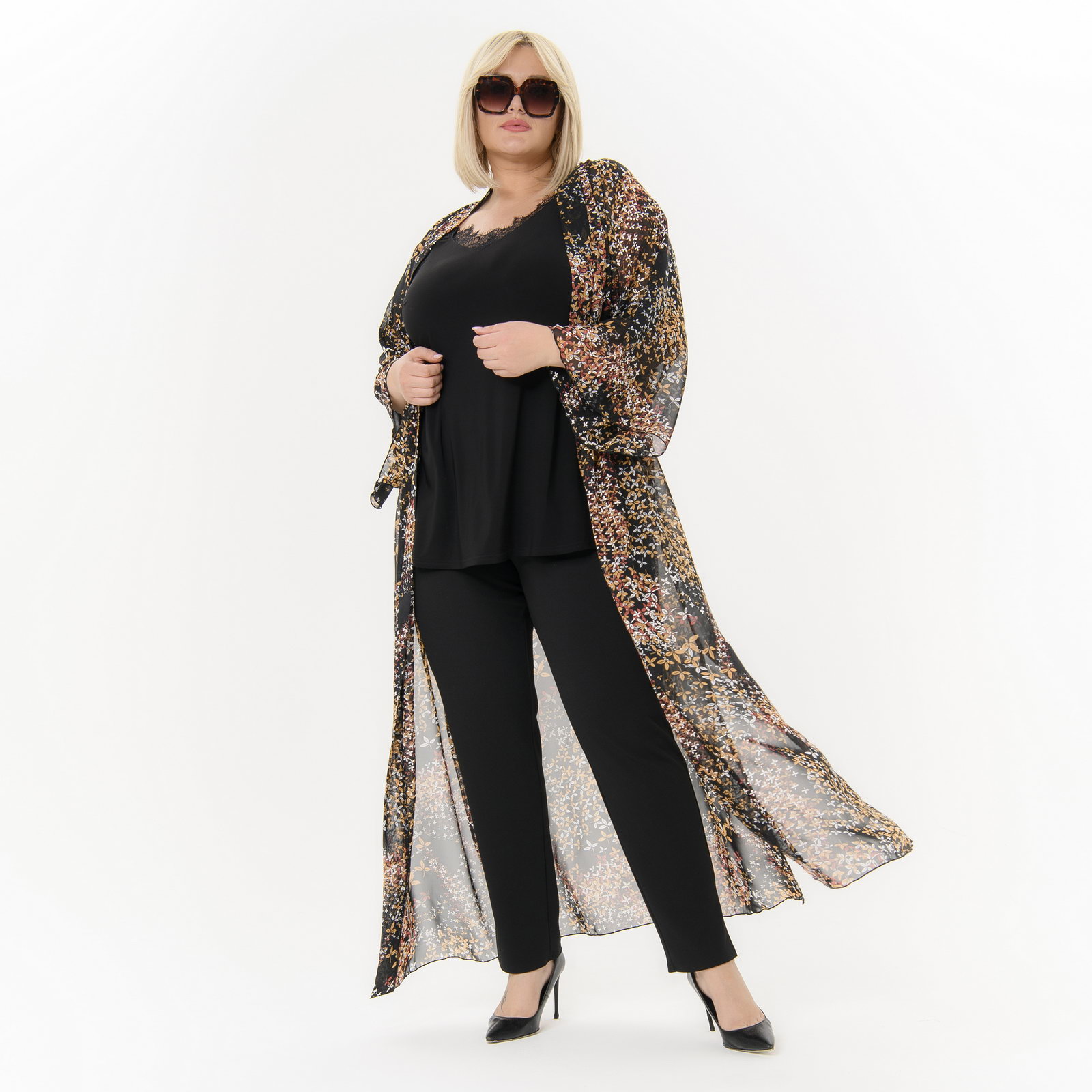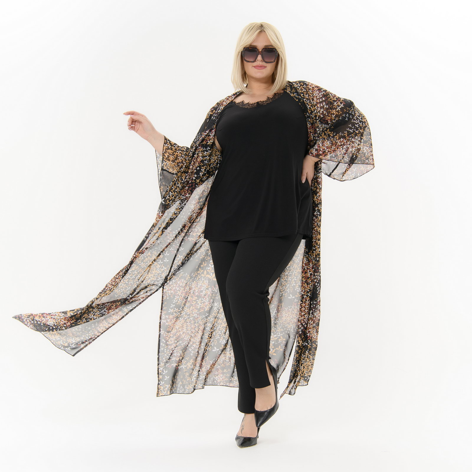 Кардиган длинный из шифона. По низу боковых швов разрезы. Рукав расклешенный. Эта модель уникальна, она способна дополнить легкостью и изяществом любой образ: будь то маленькое черное платье, струящиеся брюки с топом или комплект романтичного белья.