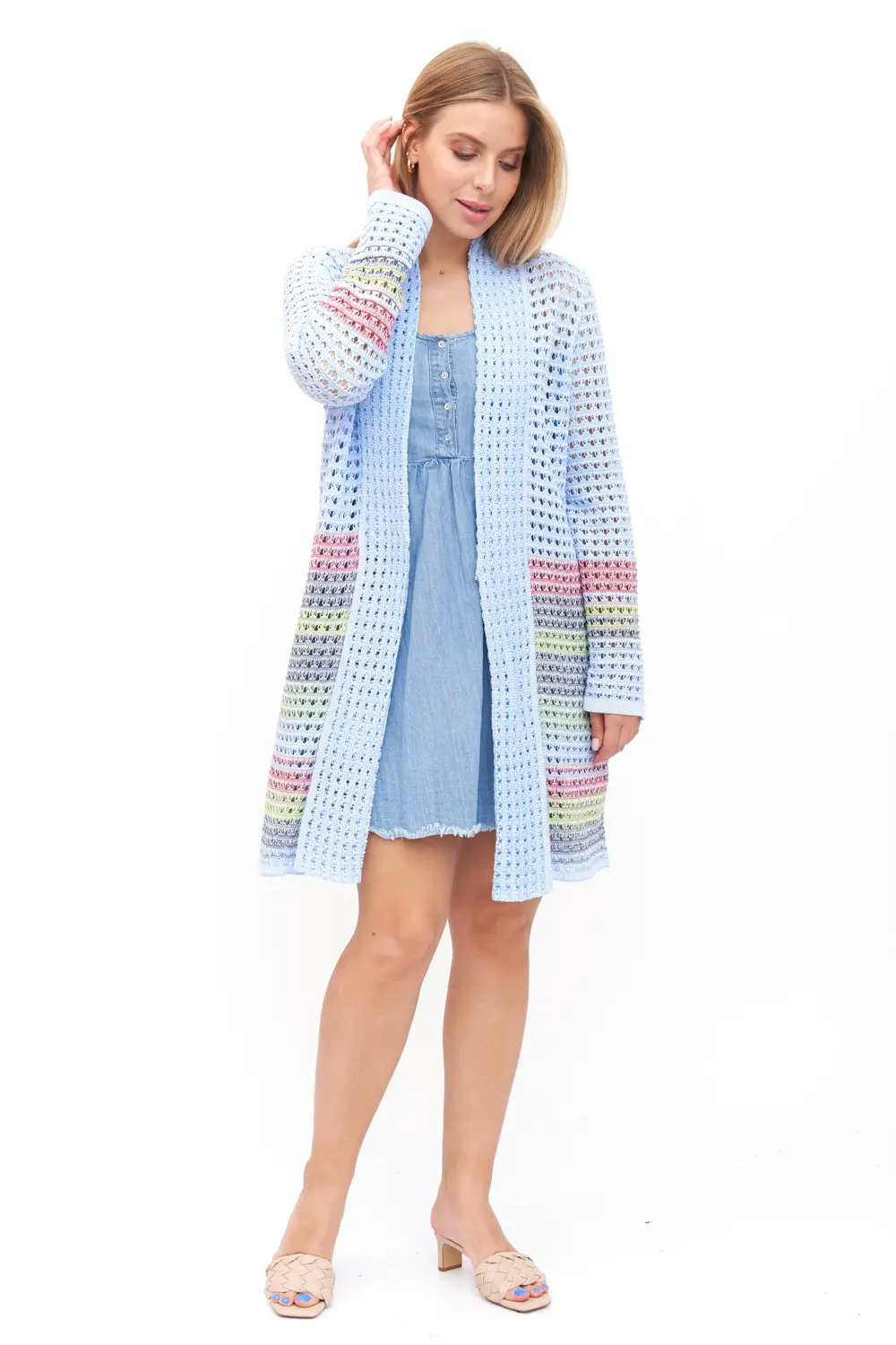 Кардиган свободного силуэта с длинным втачным рукавом.  По переду проходят отворачивающиеся борта. Небольшая застежка по переду. Кардиган выполнен переплетением "сетка" с цветными переходами. голубой микс