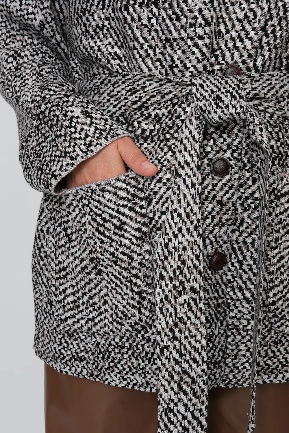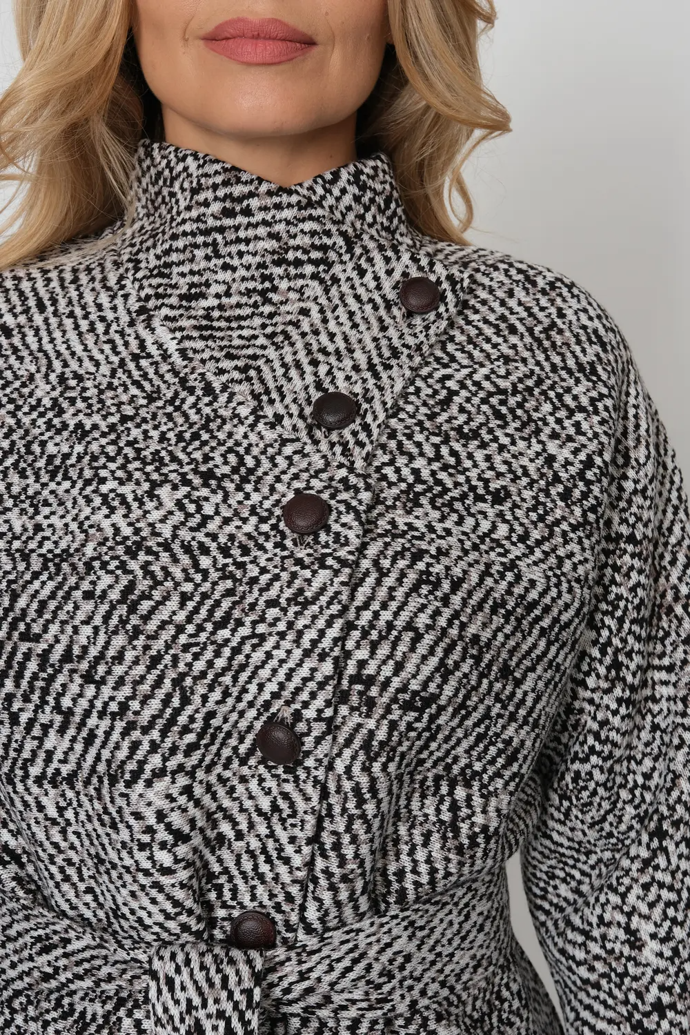 Кардиган женский трикотажный полуприлегающего силуэта длиной до середины бедра. Кардиган застегивается на пуговицы по переду и воротнику-стойке. Рукав цельнокроенный длинный.  Накладные симметричные карманы. Изделие выполнено жаккардовым переплетением образующим мелкий геометрический рисунок. серый
