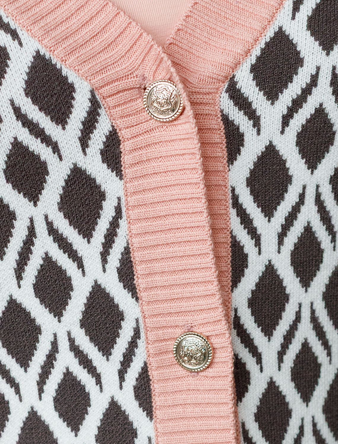 Кардиган с V-вырезом жаккардовой вязки — универсальная и женственная вещь для весны и лета. Жакет кофейно-белого цвета выполнен из приятной к телу вискозы, отличается в меру свободным кроем, который подчеркивает силуэт. V-вырез подчеркивает зону декольте и визуально вытягивает шею, делая фигуру более изящной. Спущенная линия плеча создает расслабленный силуэт, добавляя комфорта и свободы движений, что отлично подойдет для девушек и женщин плюс сайз размеров. Модель на пуговицах обеспечивает удобство в носке и добавляет классическую нотку образу. Контрастная отделка гармонично сочетается с выразительным геометрическим рисунком, который придает образу индивидуальность и современность. Принт немного напоминает благородный орнамент аргайл, Карманы-обманки украшают, сохраняя лаконичность внешнего вида, Кардиган средней длины оптимален для создания разных комбинаций на каждый день. Такой жакет легко впишется в офисный или повседневный образ благодаря своей универсальности и современному стилю. Вискоза дарит ощущение комфорта даже в теплую погоду, а качественная жаккардовая вязка сохраняет форму после стирки.
