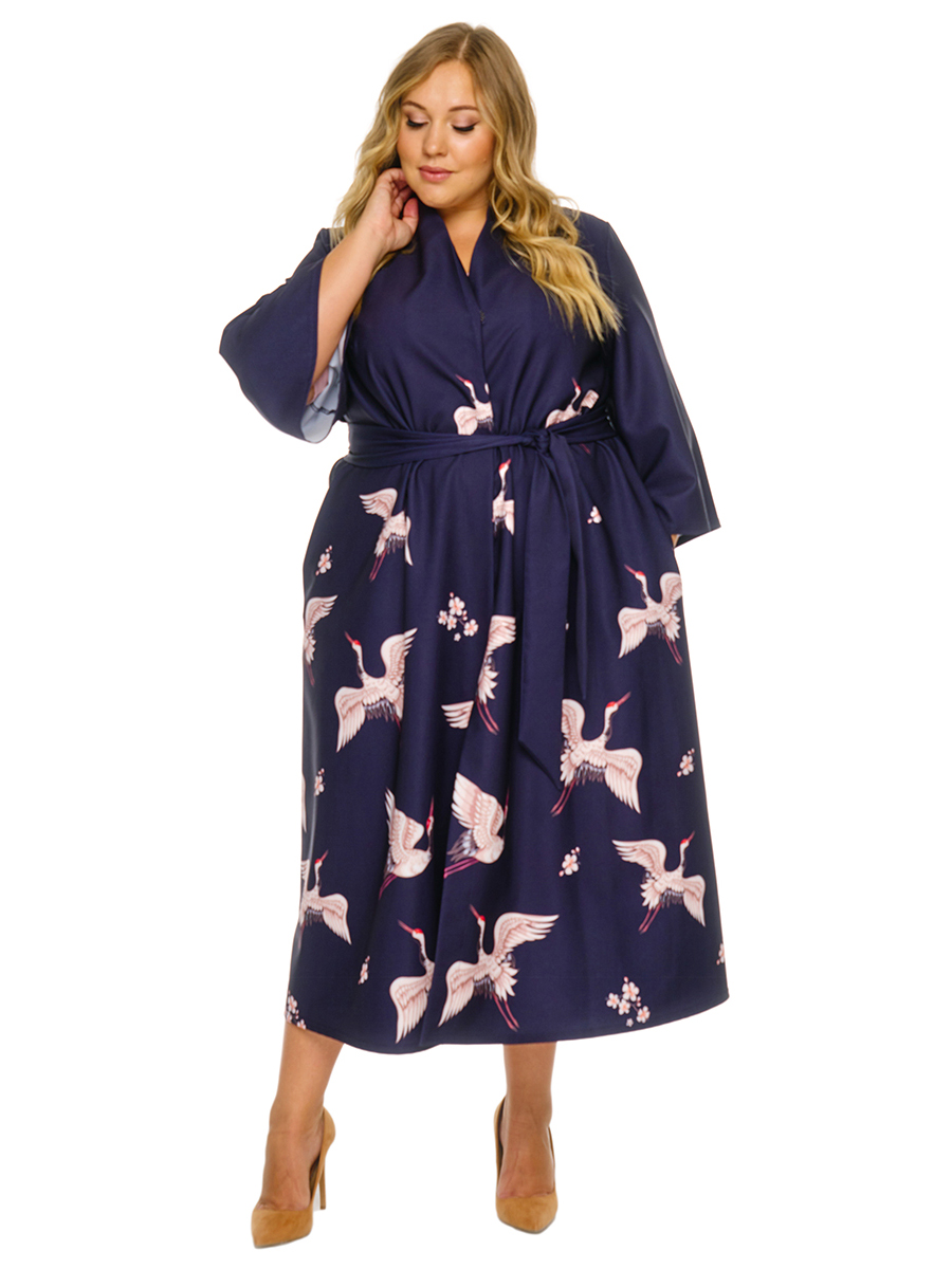 Удлиненный свободный кардиган  в стиле "кимоно" из крепа с эластаном. обработкой. Скругленный край борта спереди плавно переходит в аккуратную цельнокроенную стойку на спинке, подчеркивая изящество  линий. Рукав расклешенный. Застежка на 2 кнопки. Завязывается на пояс в тон основной ткани.