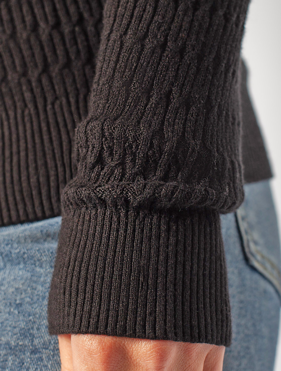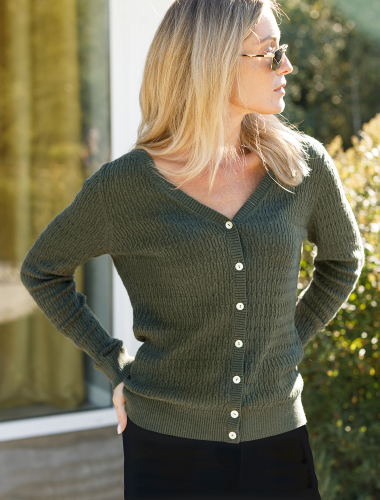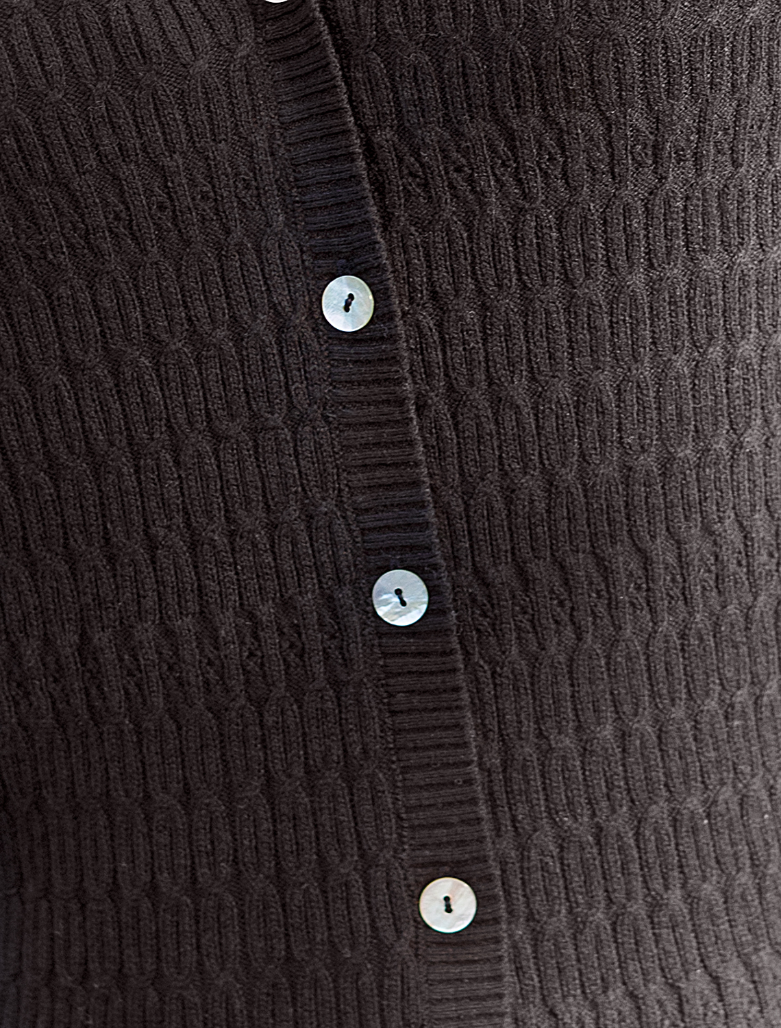 Кардиган тонкой вязки выполнен из хлопка с вискозой. Нежную пряжу, очень приятную к телу, дополняет ажурный узор - плетение косы напоминающий звенья колец. Застежка на пуговицы из натурального перламутра. Модель отлично впишется в весенний и летний гардероб, как самостоятельный верх или накидка на топ или платье. Комфортная длина и крой подходят для любой фигуры. черный