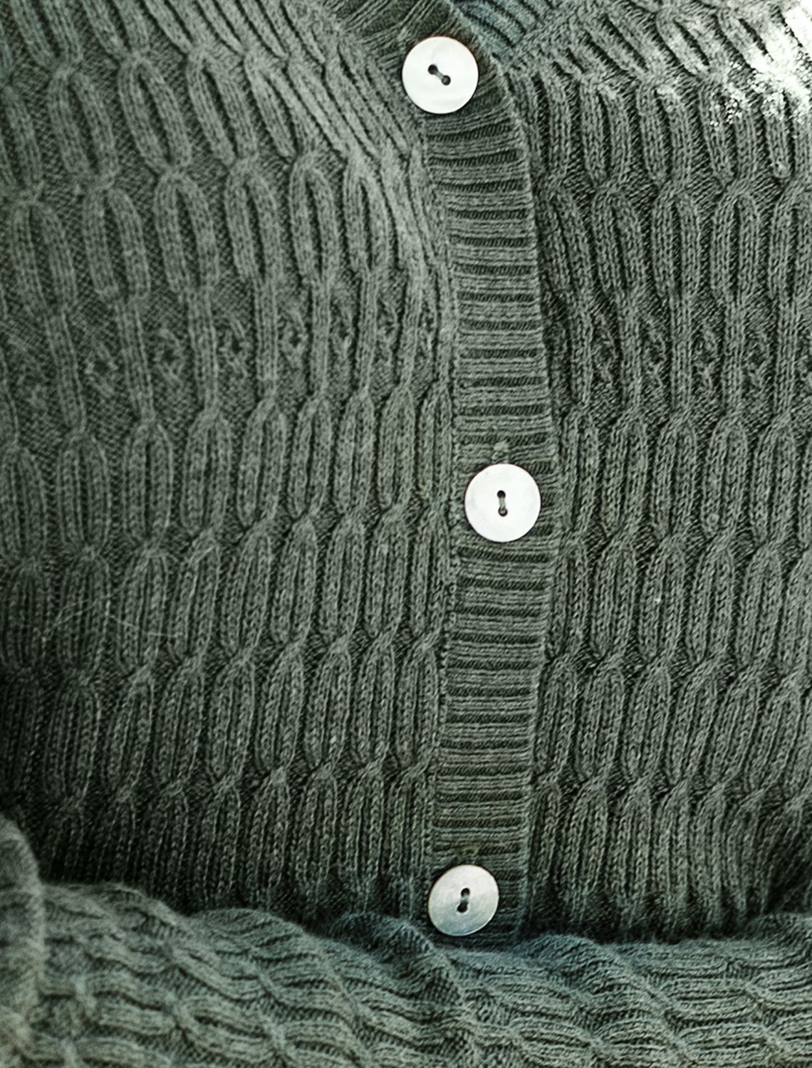 Кардиган тонкой вязки выполнен из хлопка с вискозой. Нежную пряжу, очень приятную к телу, дополняет ажурный узор - плетение косы напоминающий звенья колец. Застежка на пуговицы из натурального перламутра. Модель отлично впишется в весенний и летний гардероб, как самостоятельный верх или накидка на топ или платье. Комфортная длина и крой подходят для любой фигуры.