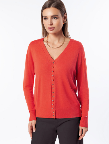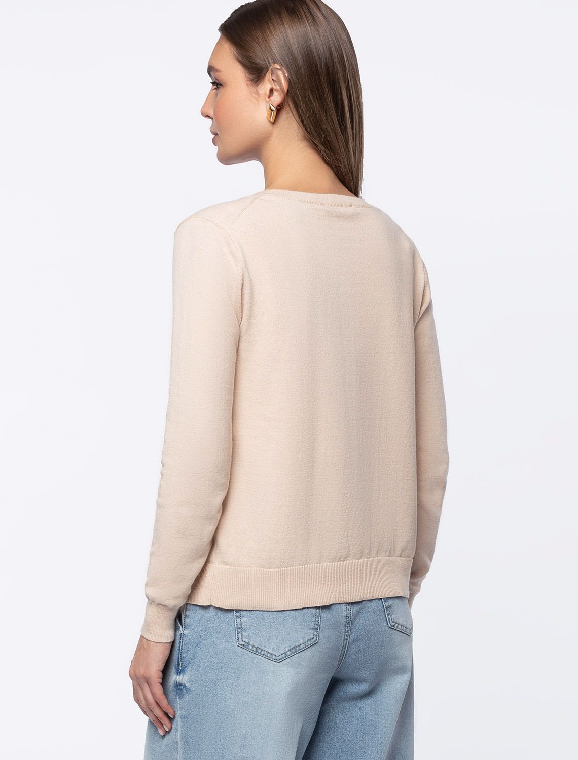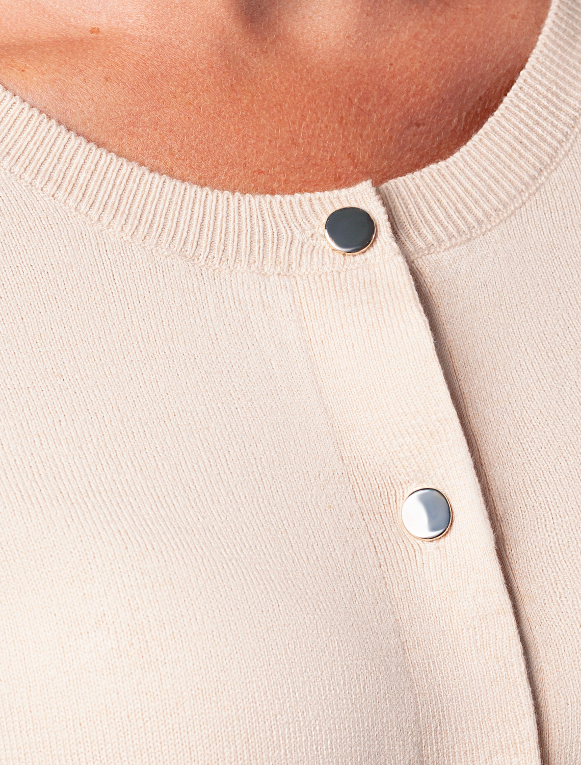 Кардиган тонкой вязки выполнен из хлопковой пряжи с добавлением кашемира. Такой состав обеспечивает настоящий комфорт, изделие очень приятное на ощупь, а наличие нейлона в составе гарантирует формоустойчивость. Лаконичная модель впишется в любой гардероб. Из украшений неизменно металлический логотип бренда. овсяный меланж